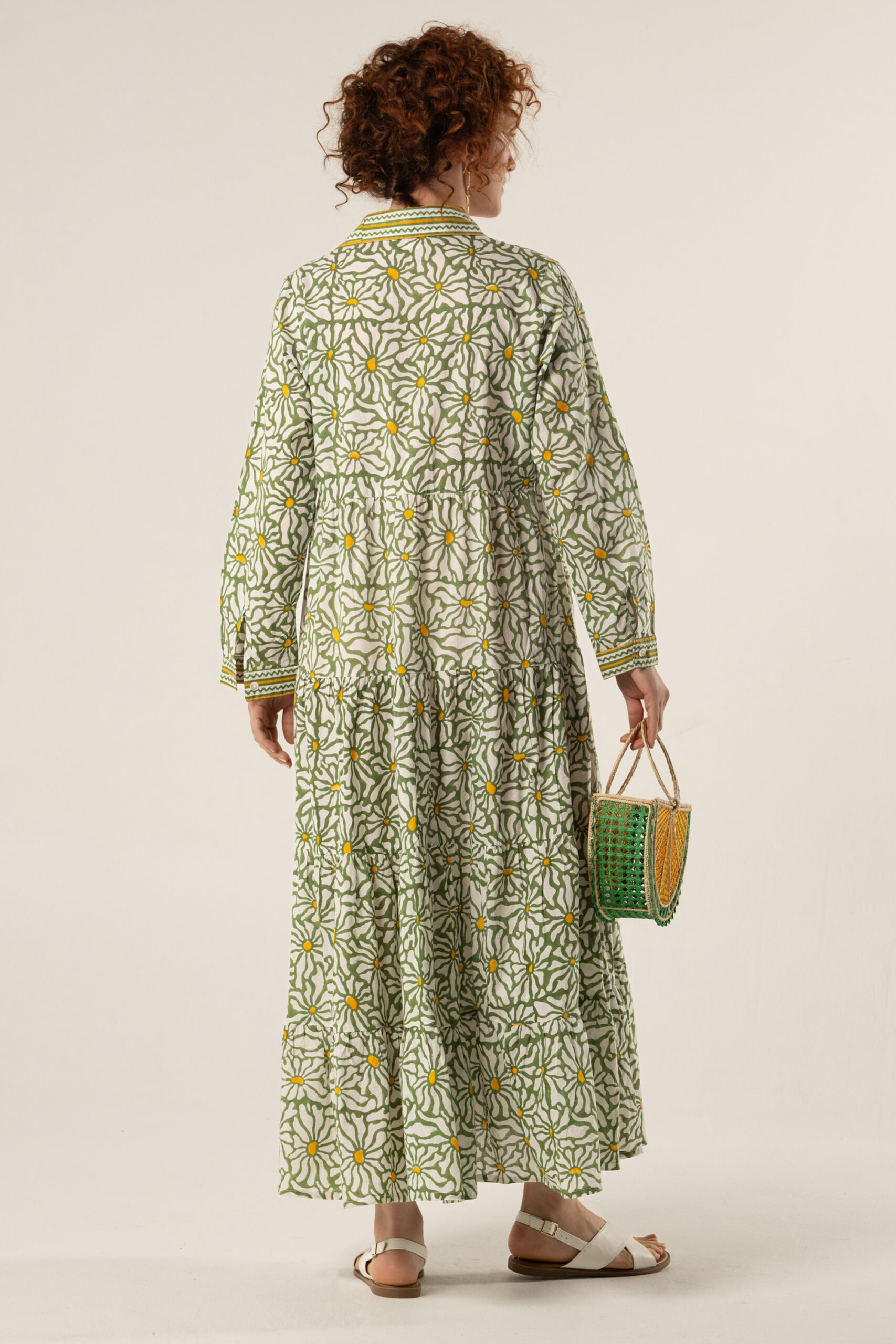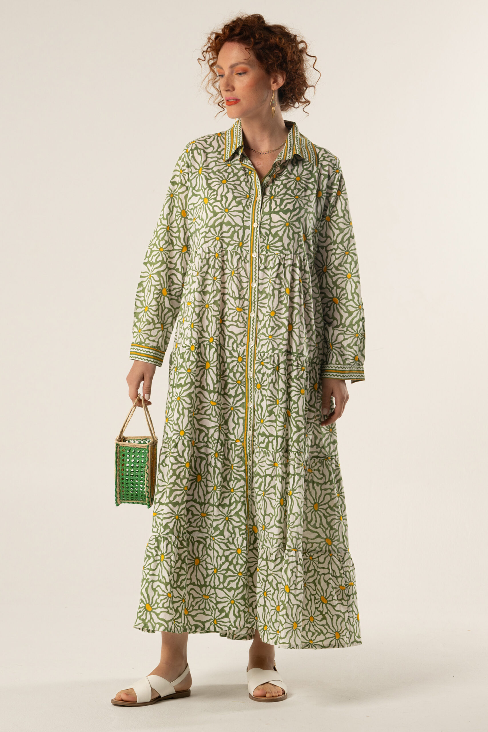 Long cotton Ikaria dress in daisy green block print with elegant yellow zig-zag details. One size, button-down style with full sleeves and tiered silhouette.