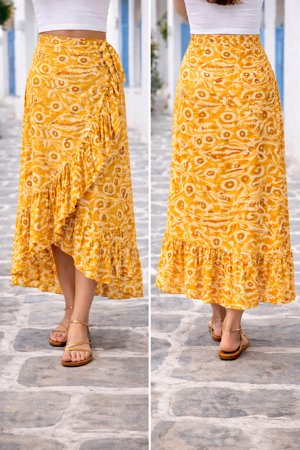 The Inez wrap skirt in our impressive prints is an elegant and versatile piece. Cut in a loose silhouette, the set features a wrap, full long skirt with elegant frills. Feel free and sensual with this bohemian style garment made of a fine blend of silk. Wear it with a plain T-Shirt for a more casual balanced look and your favorite sandals.