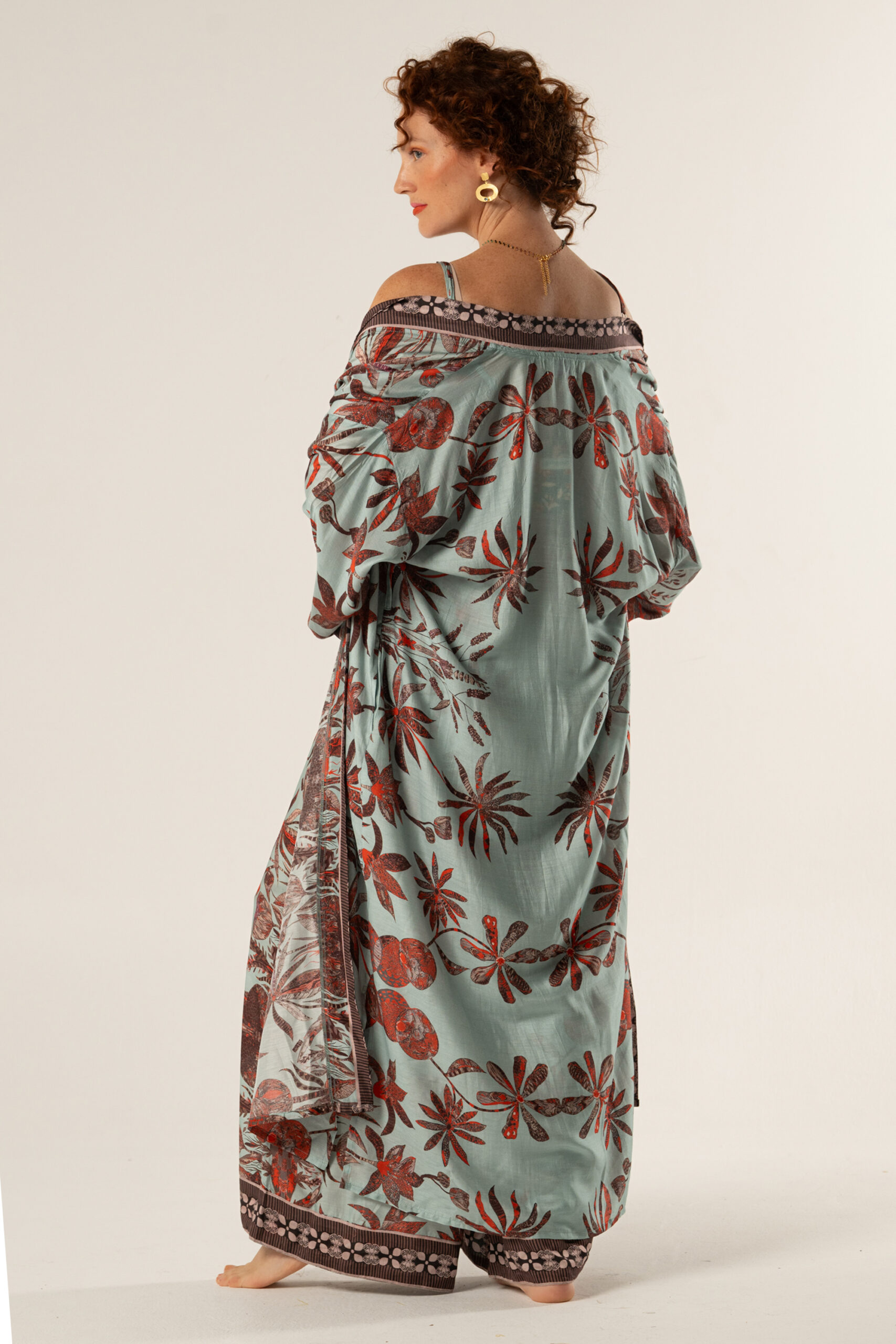 The Iris Kimono in Nature Blue print is crafted from a luxurious, lightweight cotton silk blend that drapes beautifully and feels soft against the skin.