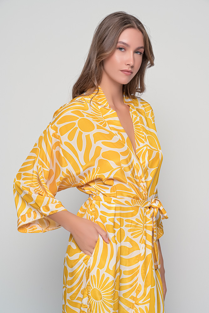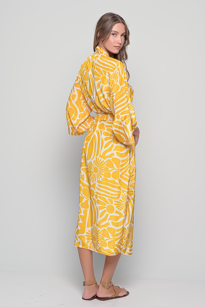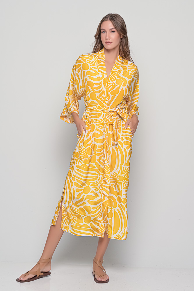 The Margaret Yellow print adds a joyful burst of color — soft floral forms on a golden-sun backdrop that instantly lifts your mood. Designed with wide kimono sleeves, an adjustable belt tie, and side slits, it flatters every figure while keeping a breezy, relaxed feel.