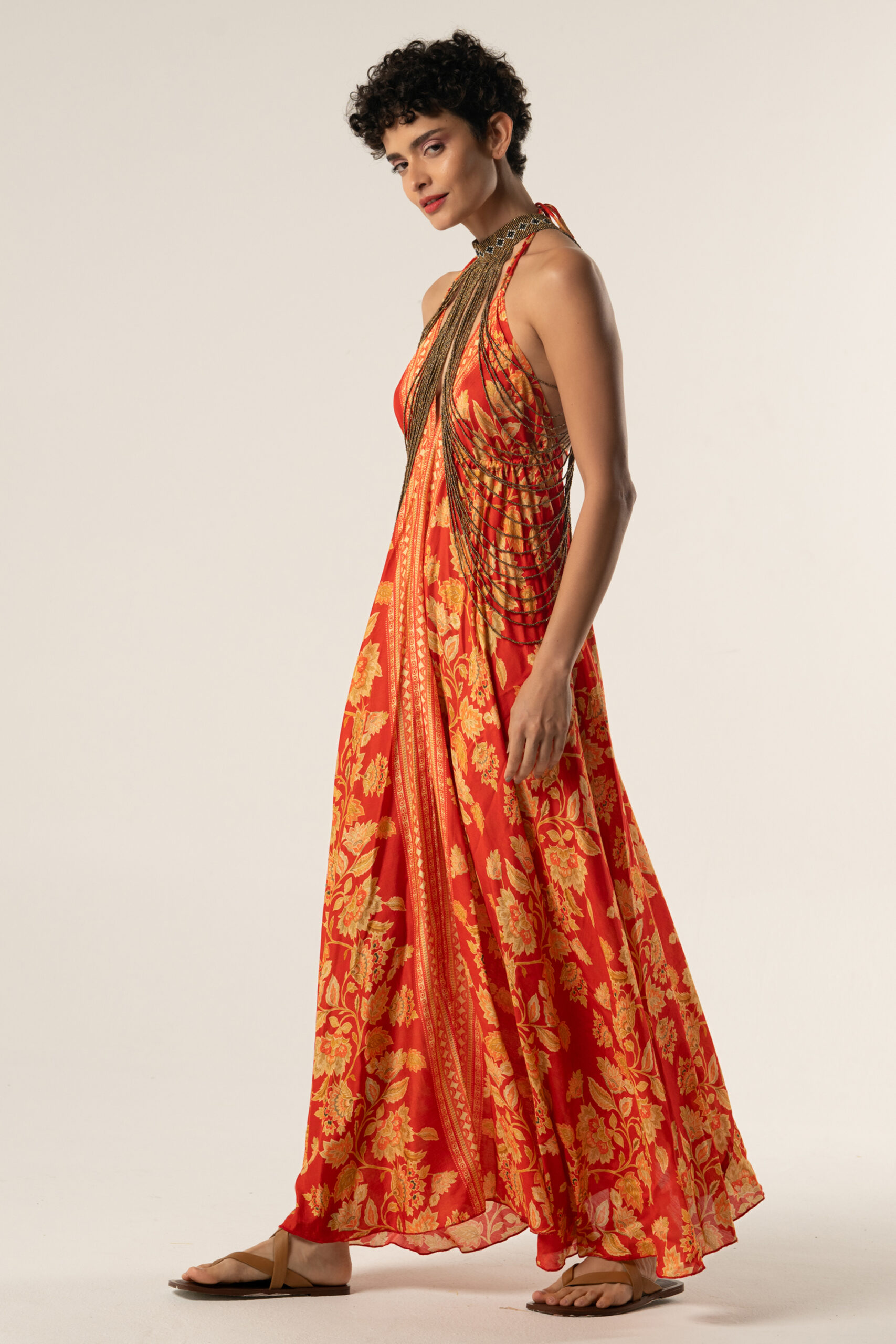 The lightweight cotton silk fabric feels soft and breathable against the skin, while the digital print allows vibrant colors and refined details to remain crisp and luminous over time. The Rama Red print brings warmth and energy, perfectly balanced with the fluidity of the long silhouette.