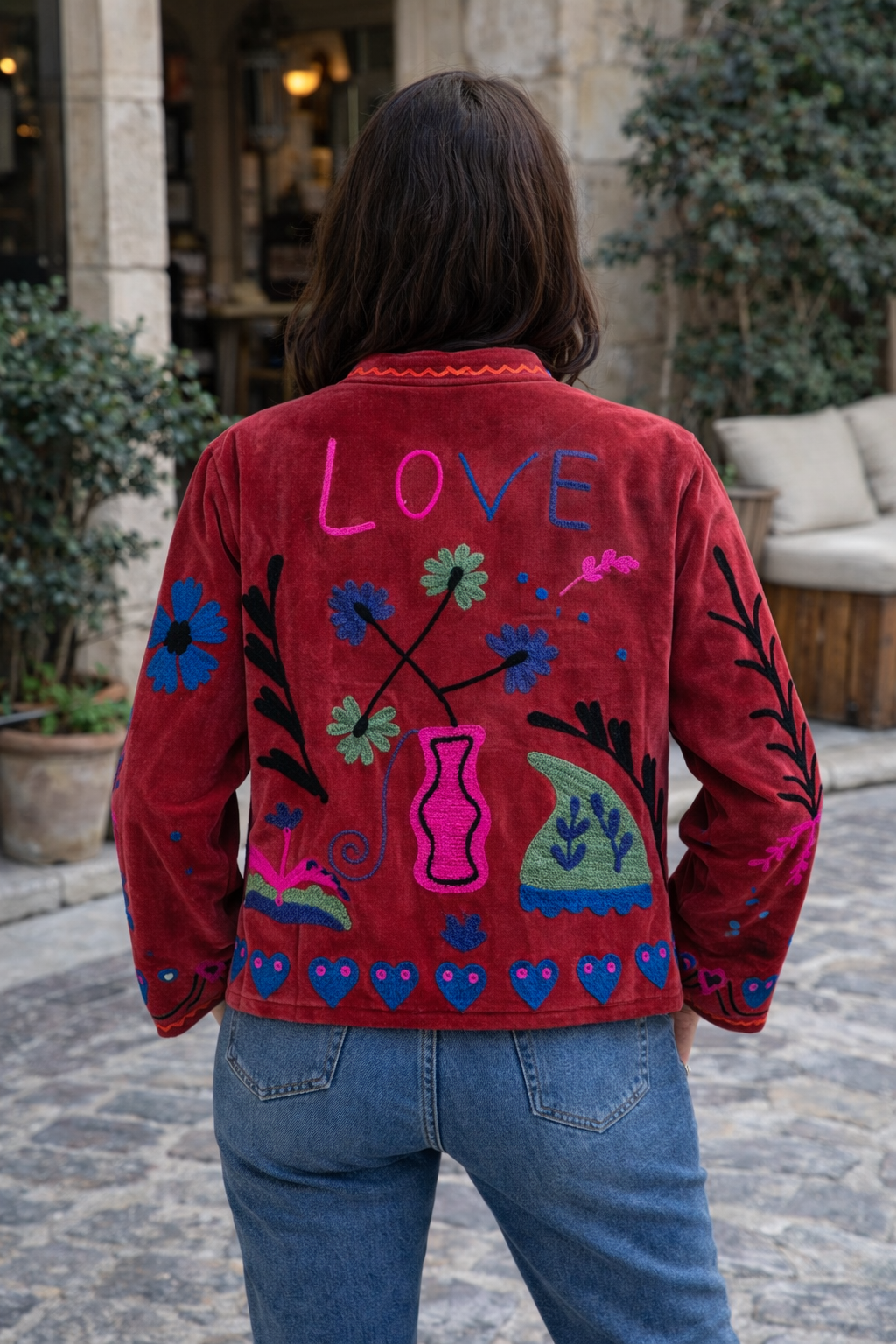 This cotton velvet jacket is a bold, artistic statement piece designed for women who express themselves through color and symbolism.