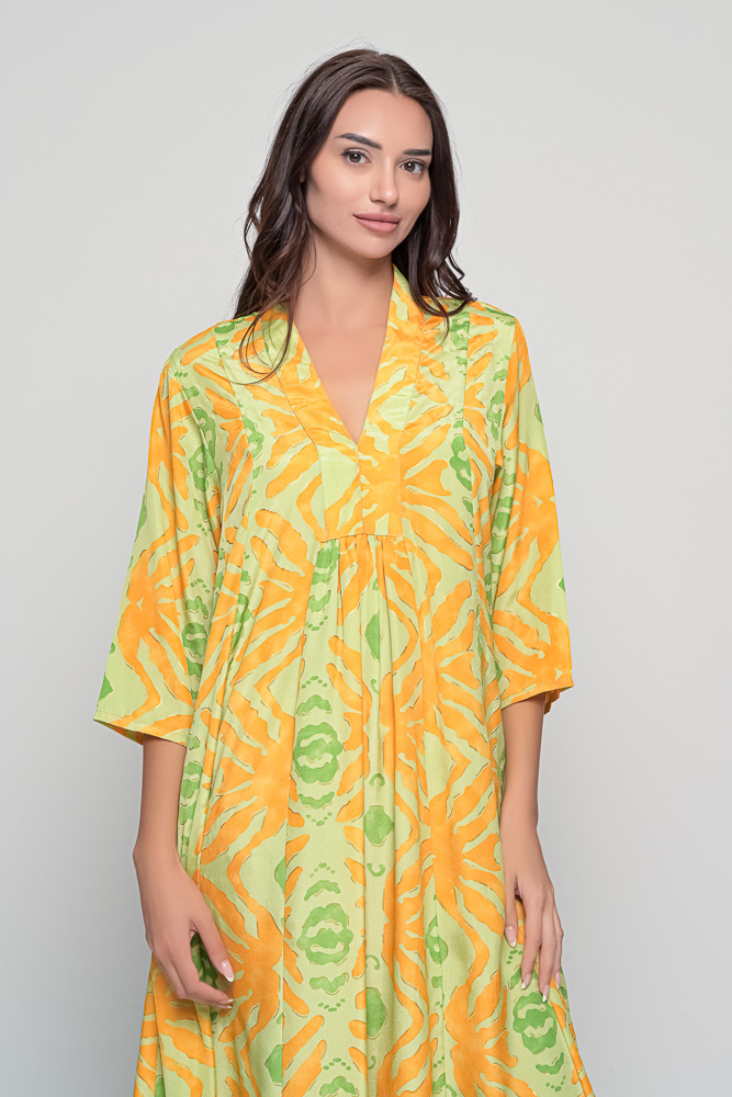 The coral seaweed-inspired print adds a vibrant yet natural charm, blending bold tones with subtle elegance. Designed with a V-neckline, 3/4 sleeves, and functional side pockets, the Marsha Dress combines versatility with sophistication.
