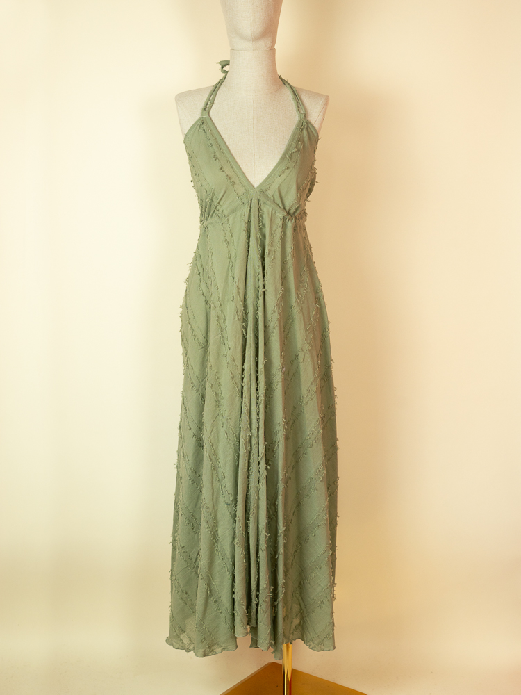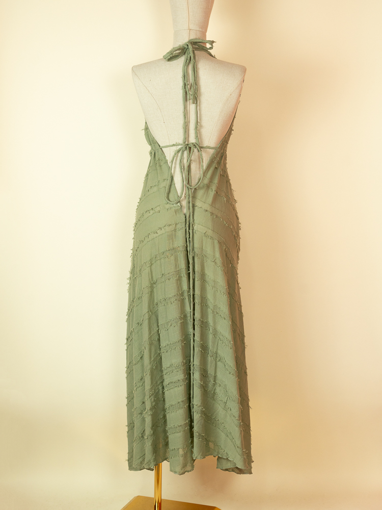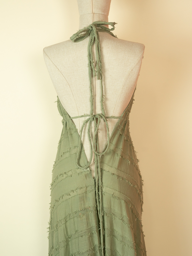 Crafted from textured cotton, it features a flattering halter neckline and a softly gathered bust that flows into a relaxed, airy shape. The open back with delicate tie details adds a sensual, refined touch while maintaining a natural, understated feel.