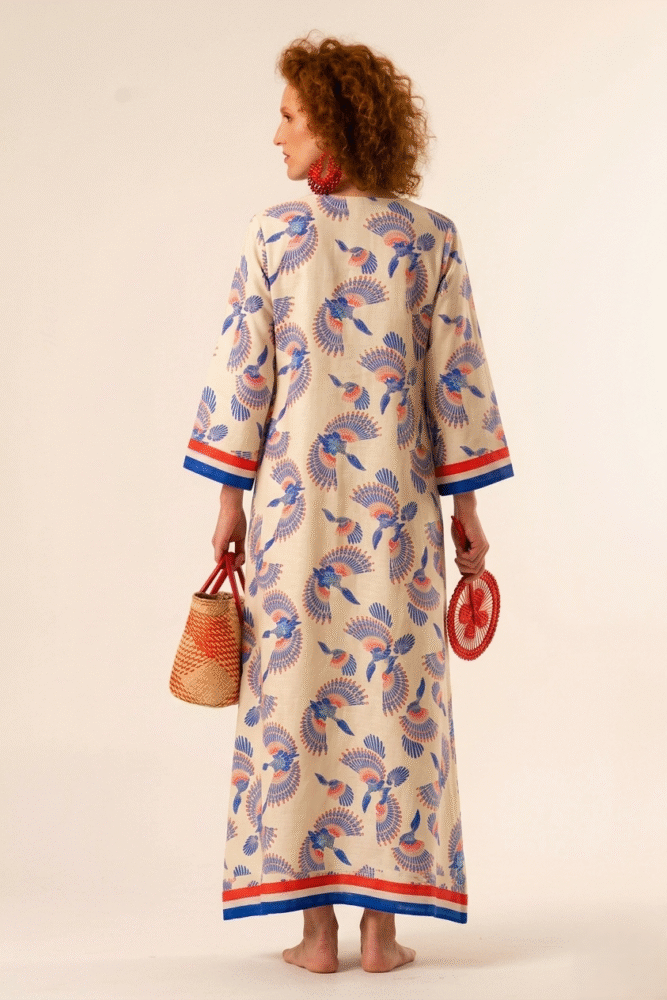 The Morocco Caftan in Fly Blue print is a timeless resort silhouette inspired by slow travel and effortless elegance. Designed in a lightweight, breathable fabric, it drapes softly on the body, offering comfort and fluid movement throughout the day.