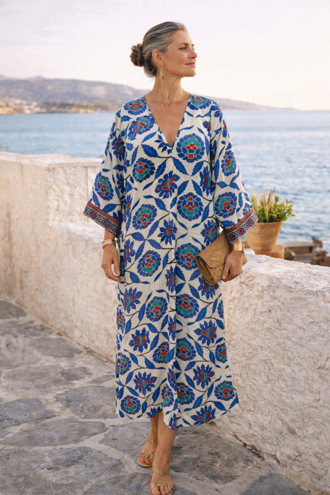 Style it simply with flat sandals for daytime ease or elevate it with statement accessories for evening resort moments. The fan, bag, and earrings shown are styling elements only and are not included with the caftan.