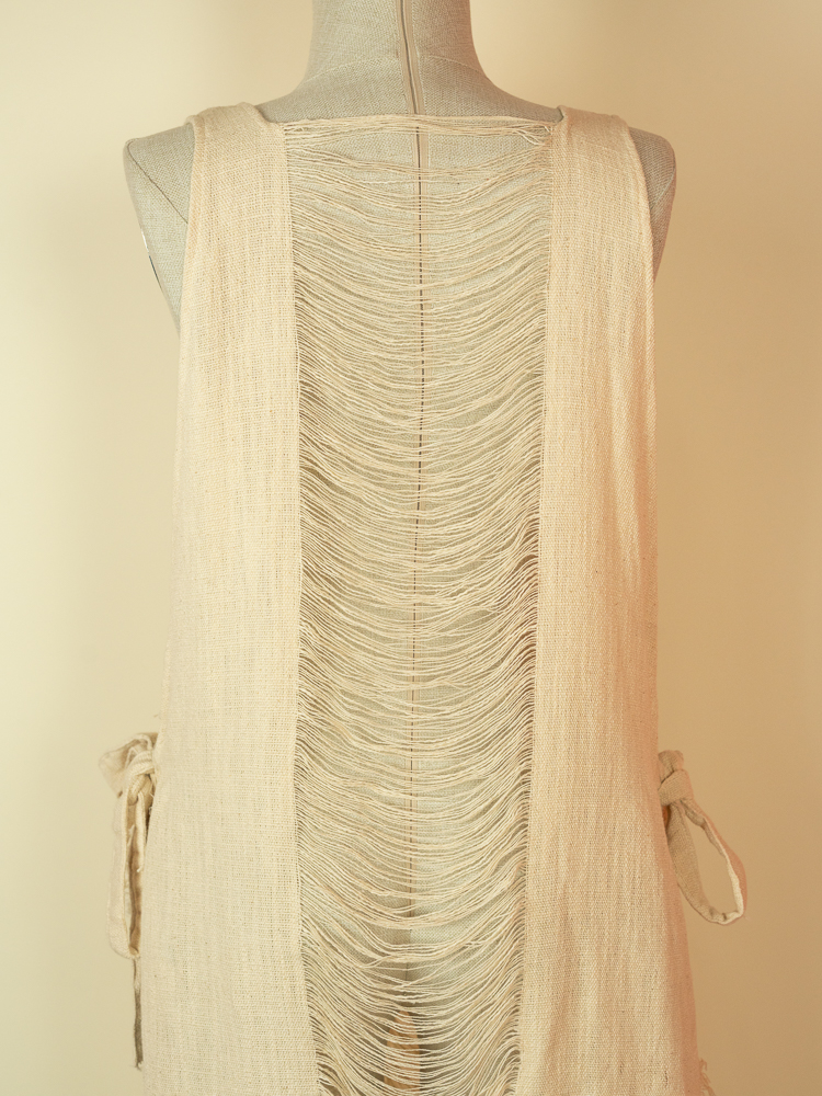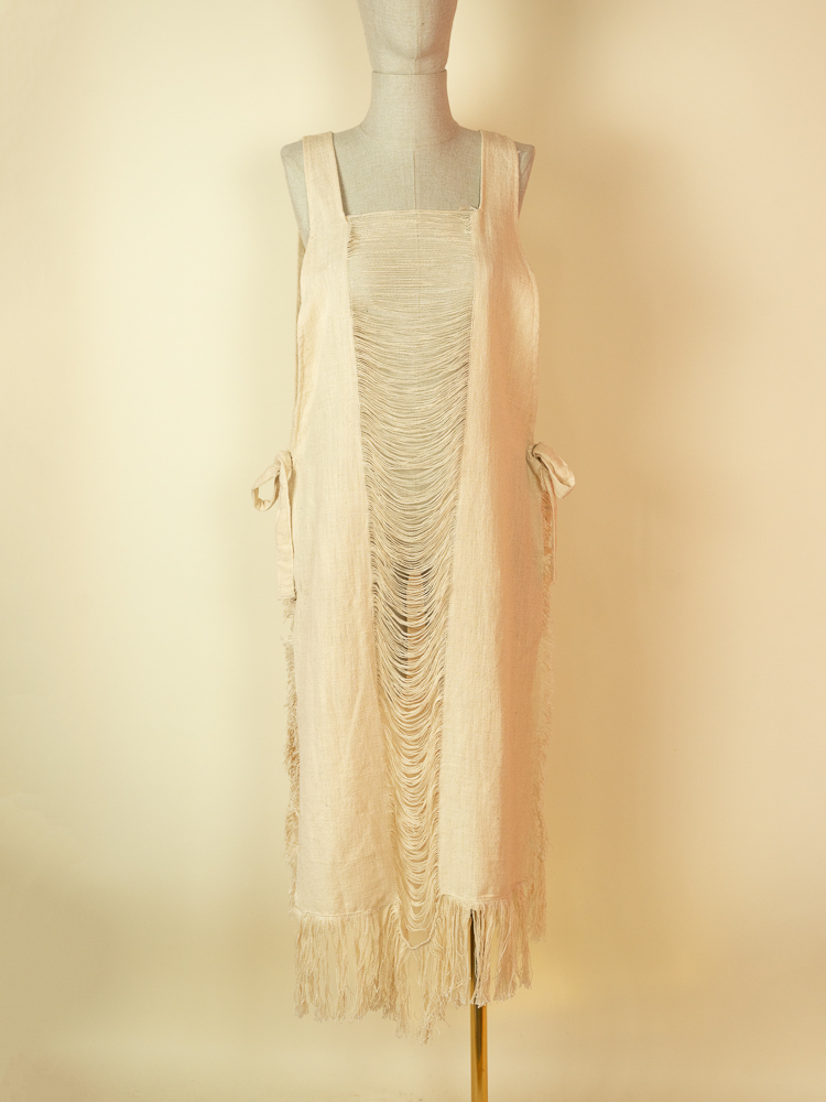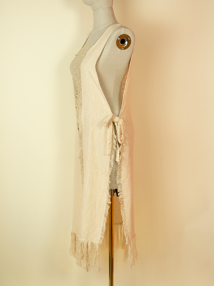 Crafted from breathable cotton, it features a distinctive handcrafted front panel and soft fringe details that add movement and character. The open, easy fit makes it ideal for layering over swimwear, while the lightweight yet structured fabric gives it a refined, elevated feel.