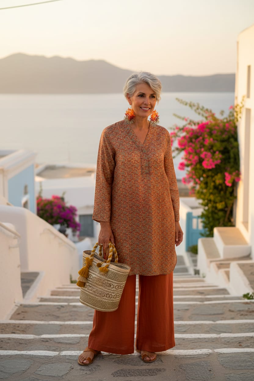 This tunic works easily with trousers, skirts, or layered looks, making it a reliable piece for everyday wear, travel, and quiet occasions.