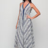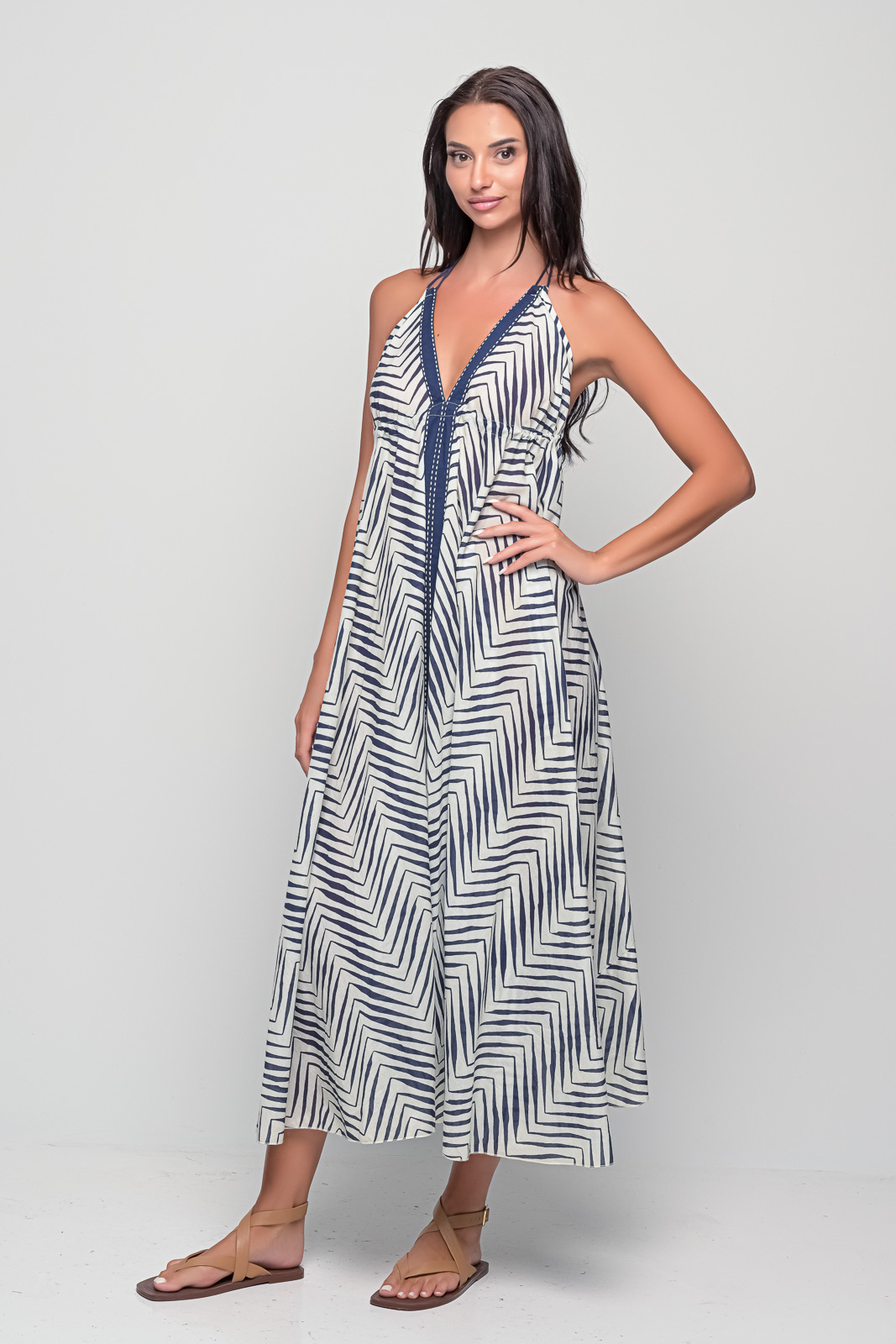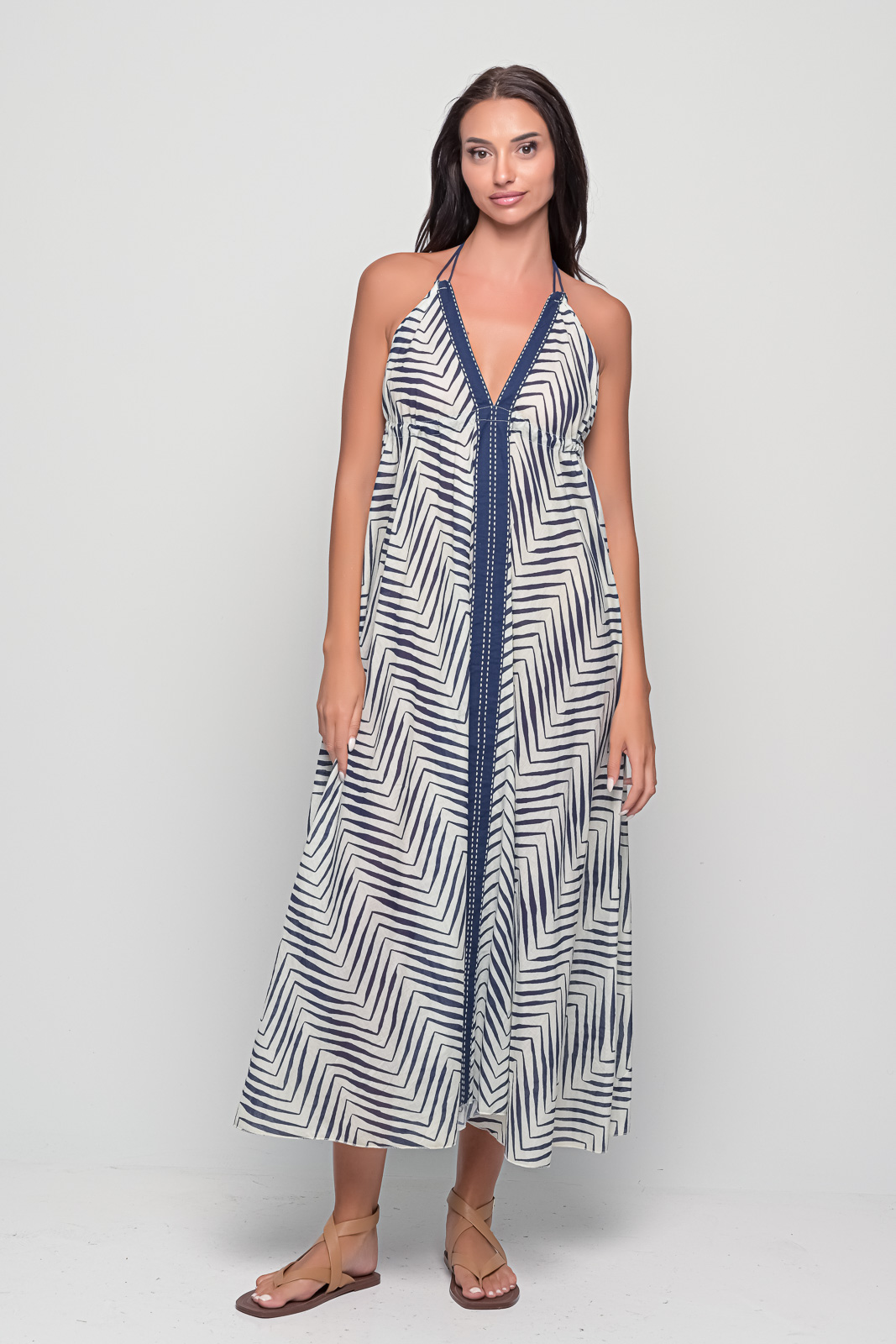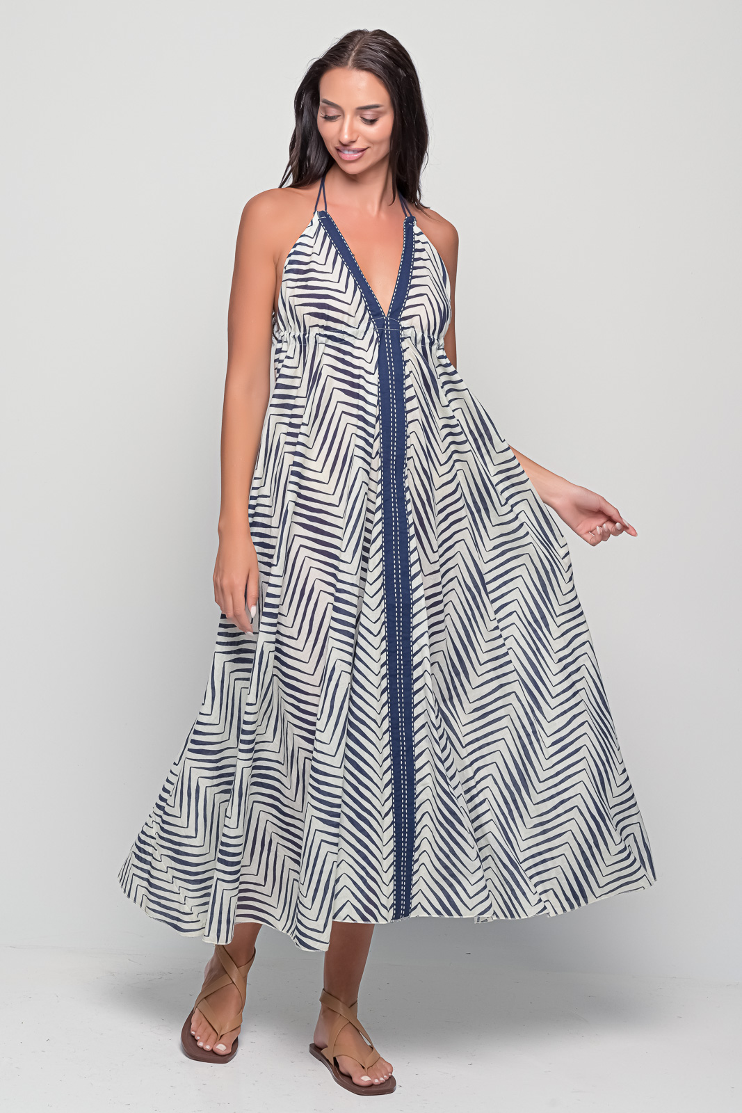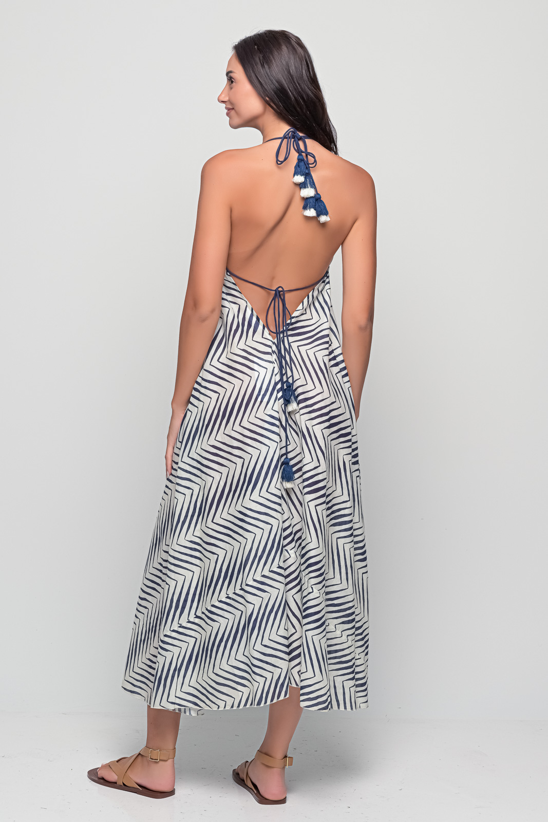 The Open Back Wave Print Cotton Maxi Dress in White brings coastal elegance to your wardrobe. With its halter neckline, open back, and flowy silhouette, this cotton maxi is perfect for summer escapes.