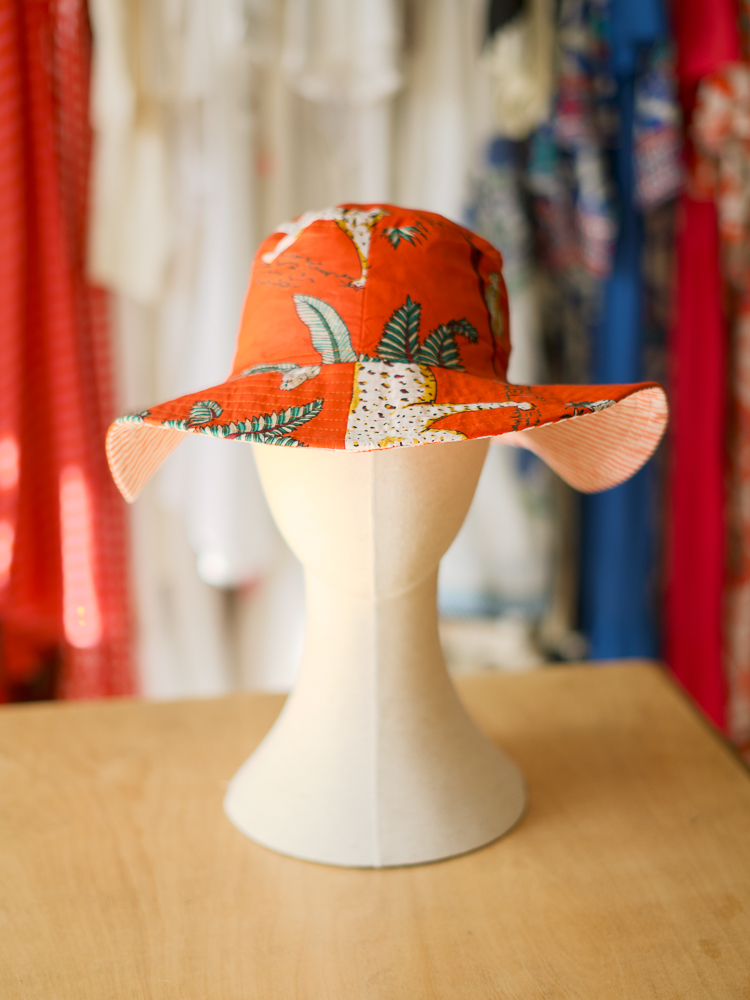 Orange cotton hat with tiger print made from lightweight washable cotton.