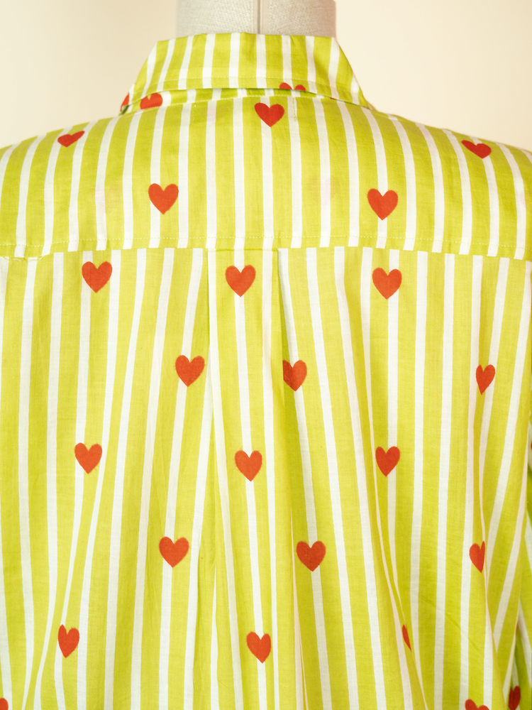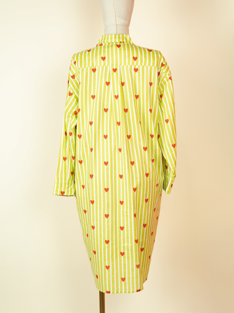 Relaxed cotton long shirt with stripes and heart print. Playful, easy and perfect for layering or standalone wear.