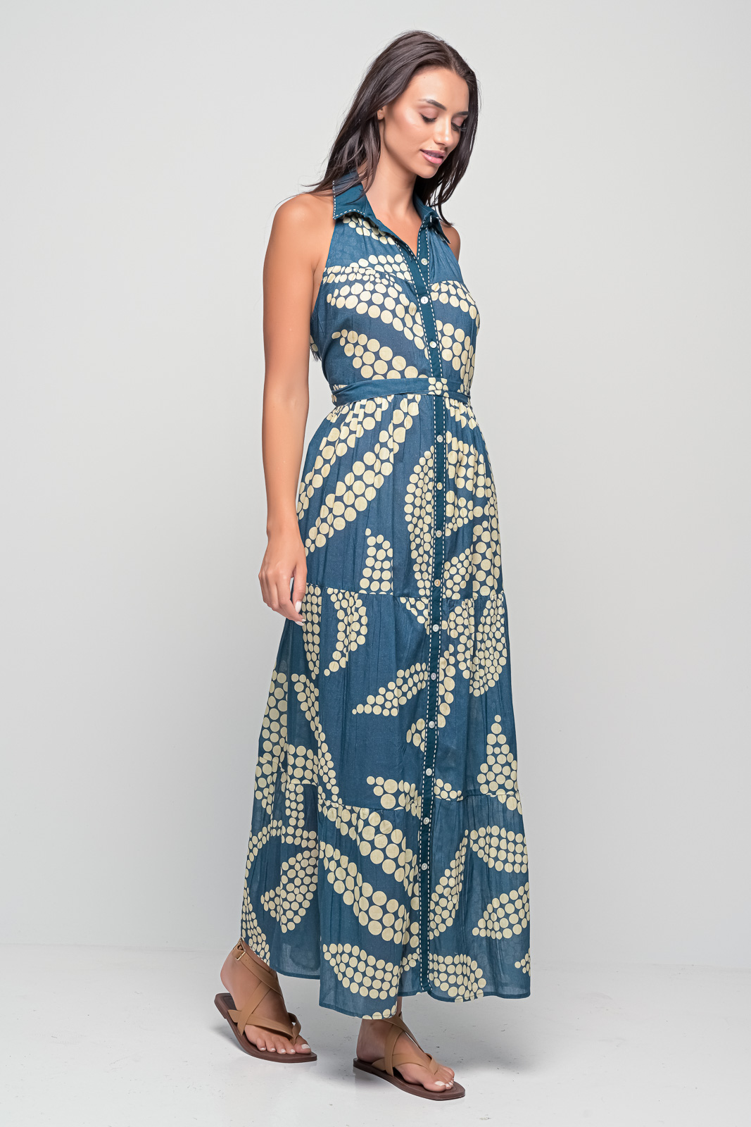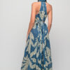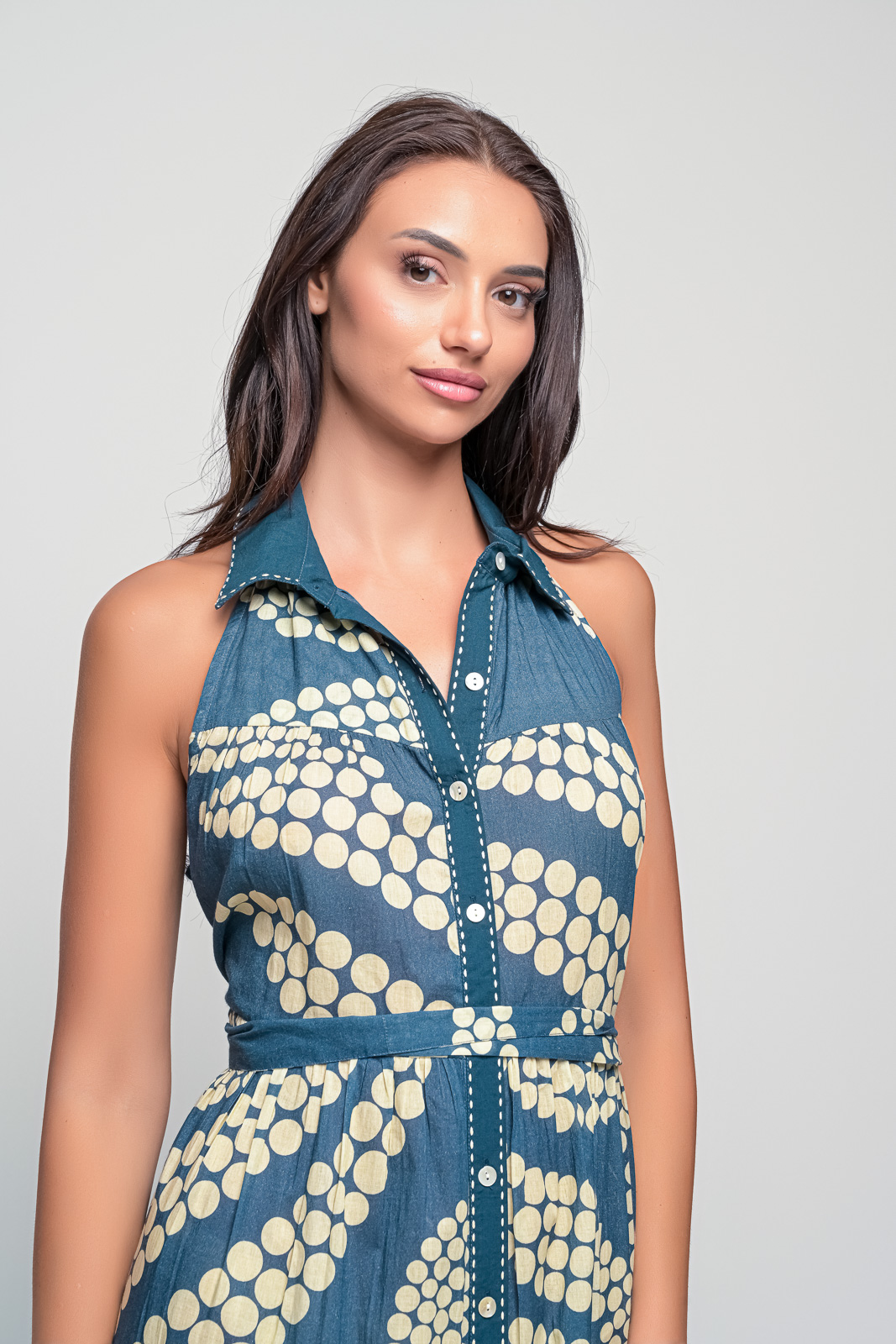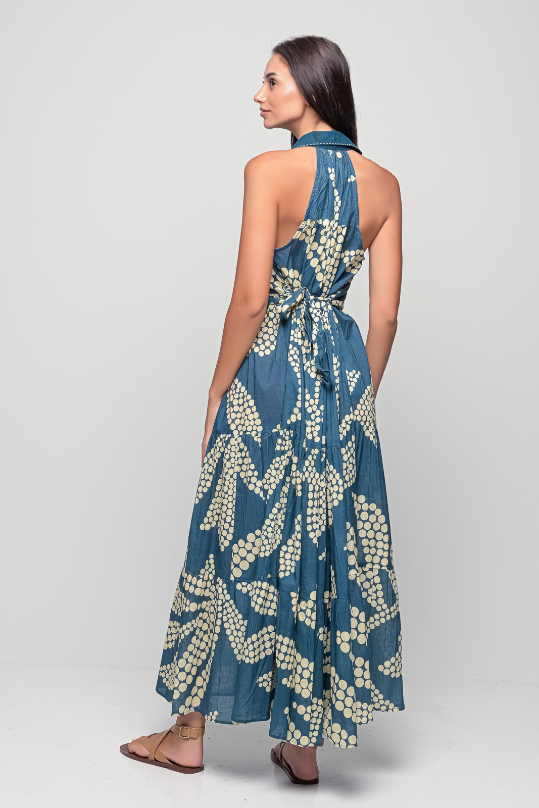 Discover modern boho elegance with the Paros Leaf Blue Cotton Maxi Dress. Crafted in lightweight cotton, this dress combines structure and flow with its button-down front, halter neckline, and adjustable waist tie. The bold Leaf print in blue adds freshness and versatility, making it ideal for summer gatherings, beach vacations, and evenings out.