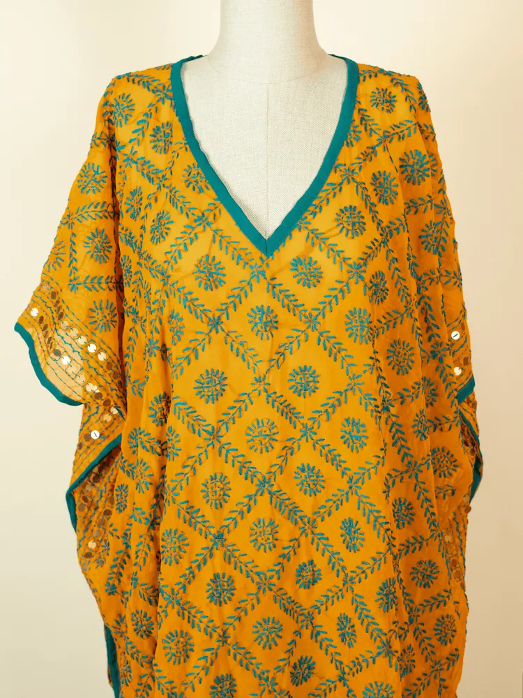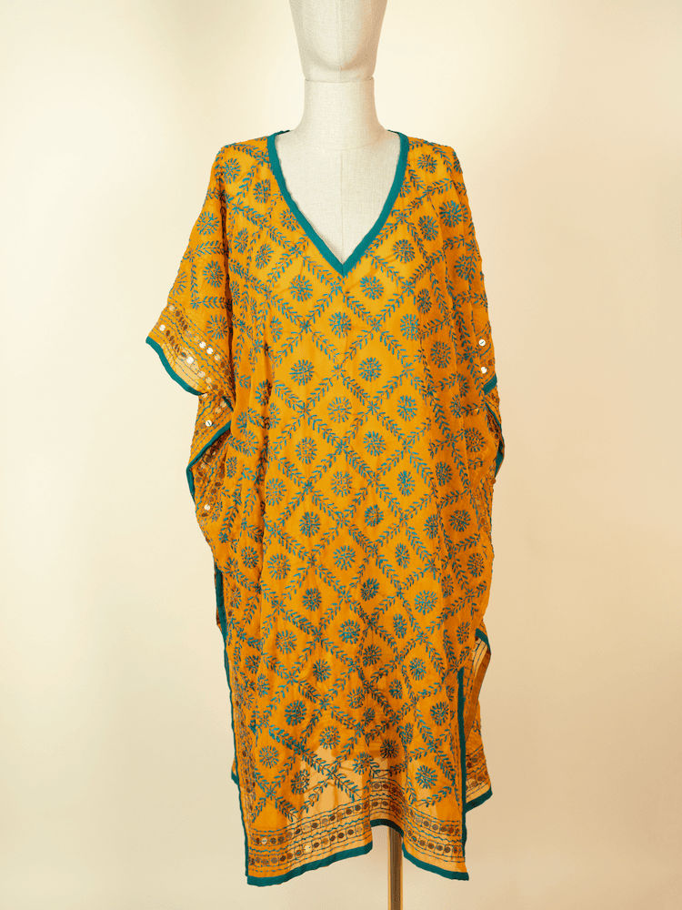 A beautiful caftan with phulkari embroidery. A truly cosmopolitan caftan that will make every plain outfit stand out.