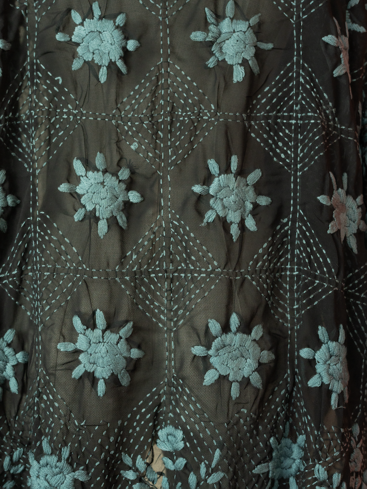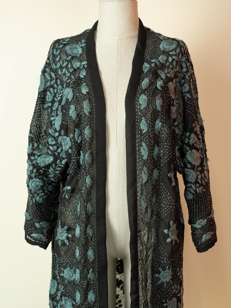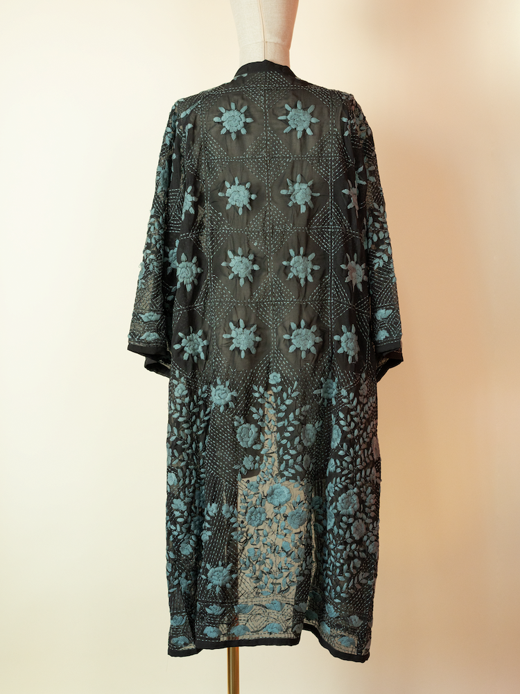 A beautiful blue kimono with phulkariembroidery. A truly cosmopolitan kimono that will make every plain outfit stand out.