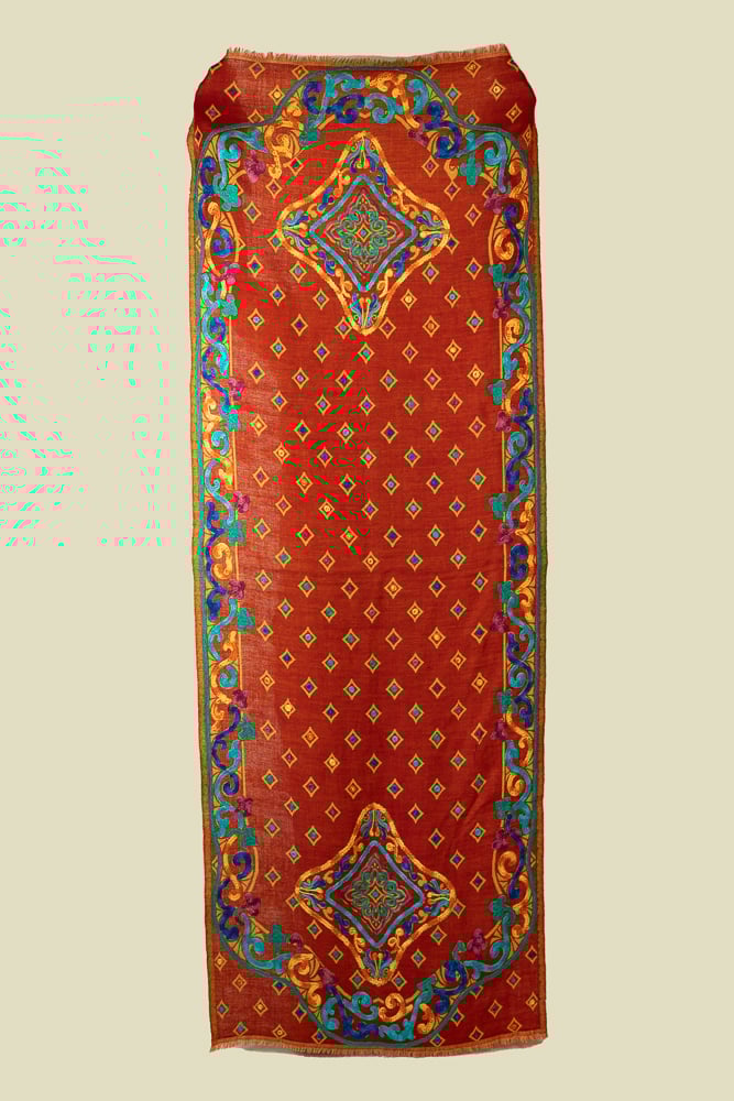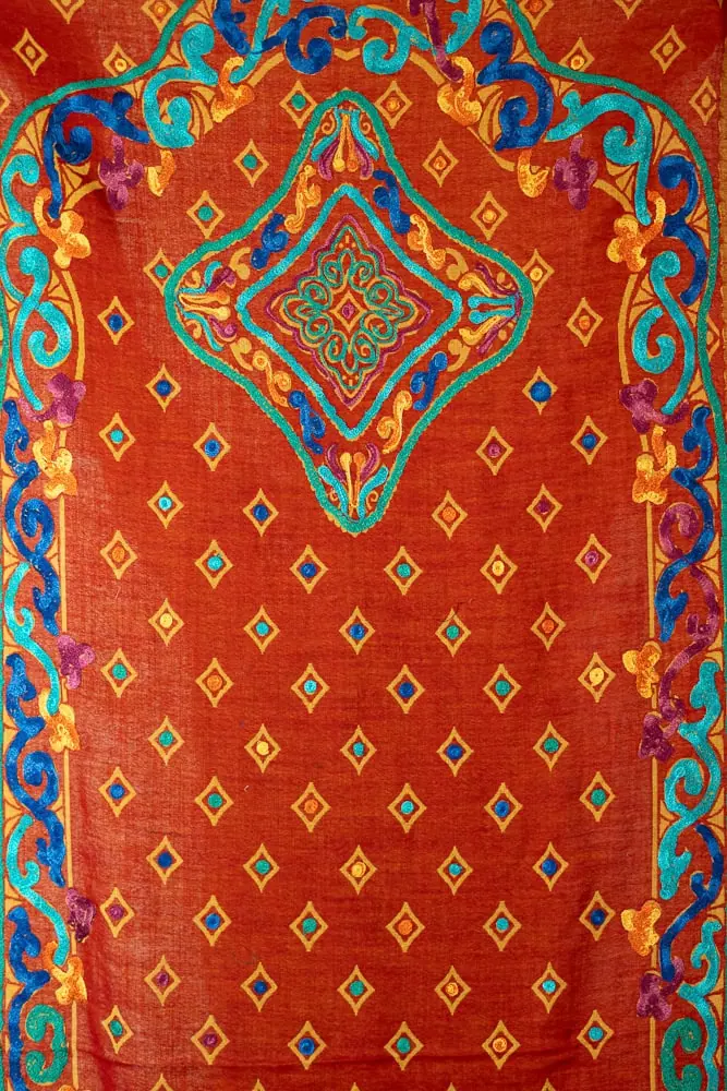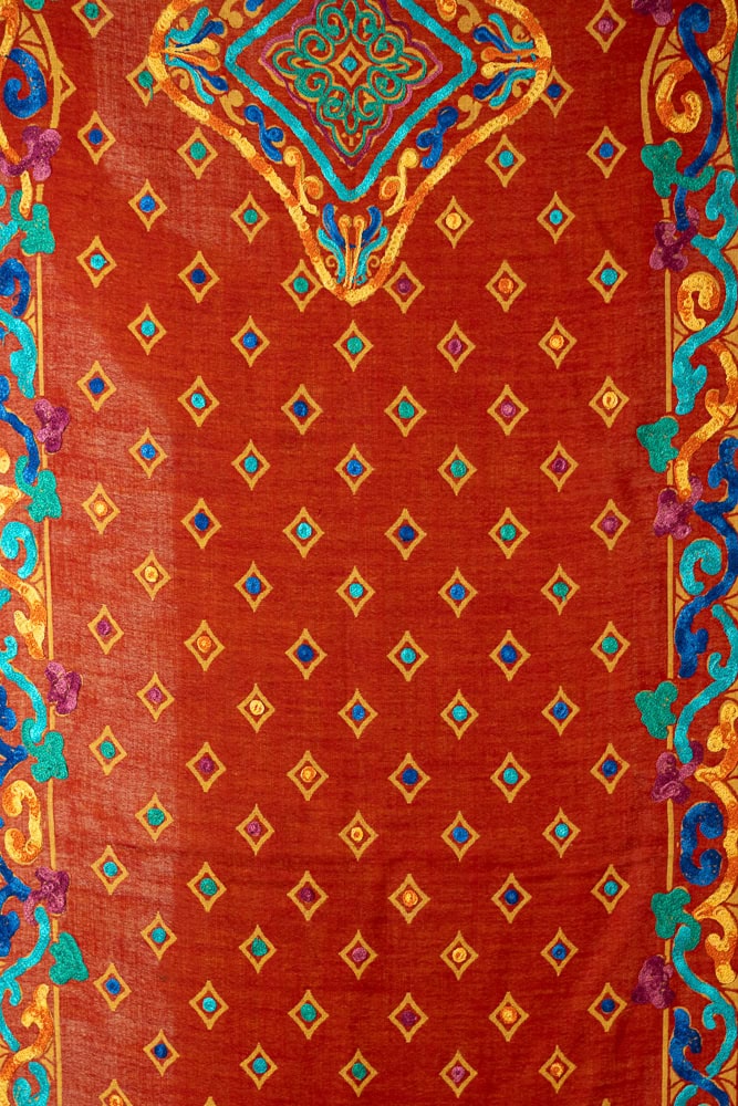 A luxurious pure wool shawl with ornate machine embroidery in shades of blue, gold and teal on a bold brick red base.