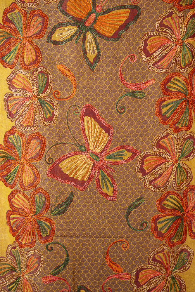 A beautiful pure wool shawl featuring butterfly and floral machine embroidery in warm earthy tones.