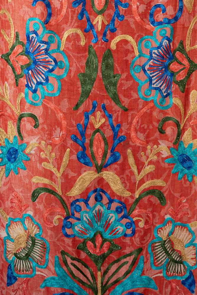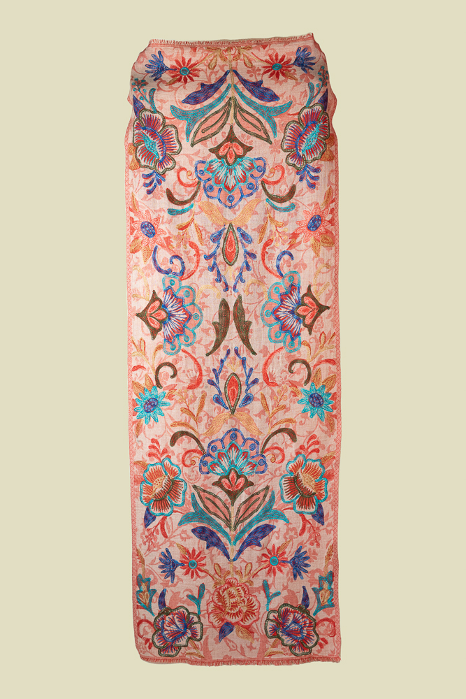 A luxurious 100% wool shawl with rich machine embroidery in vibrant turquoise and royal blue tones on a warm pink base.