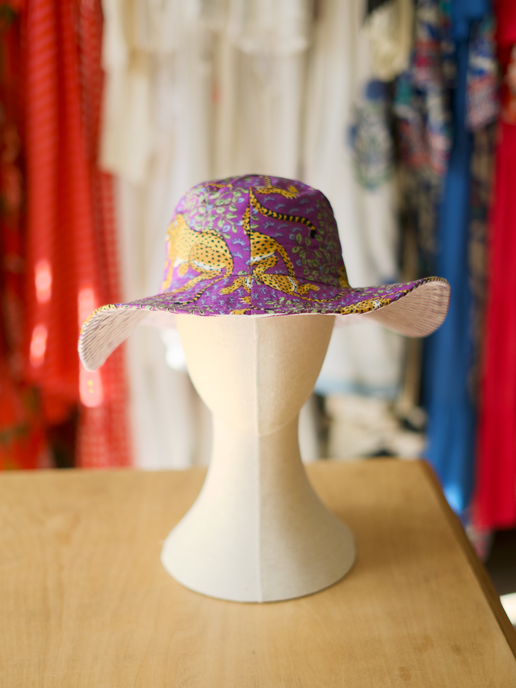 Purple cotton hat with Leopard print made from lightweight washable cotton.