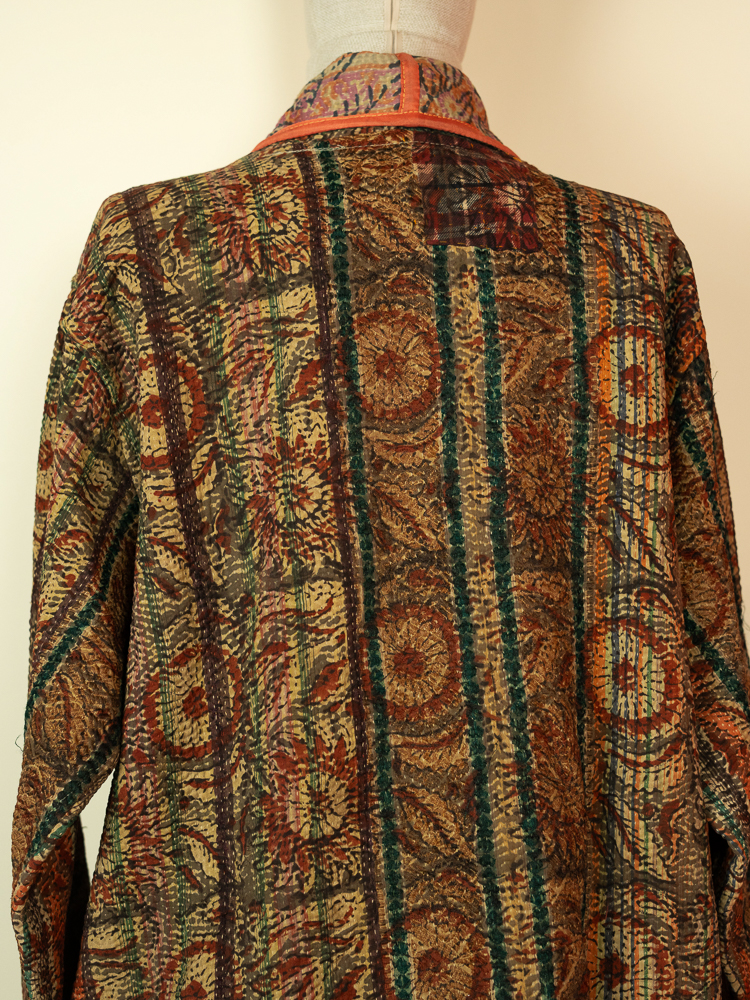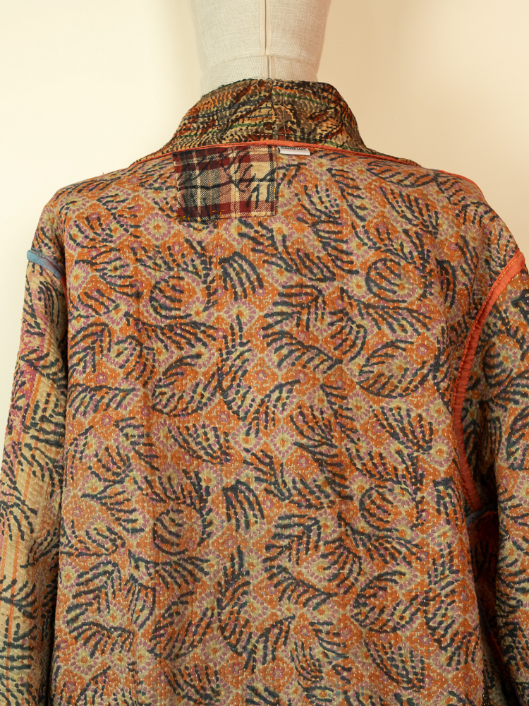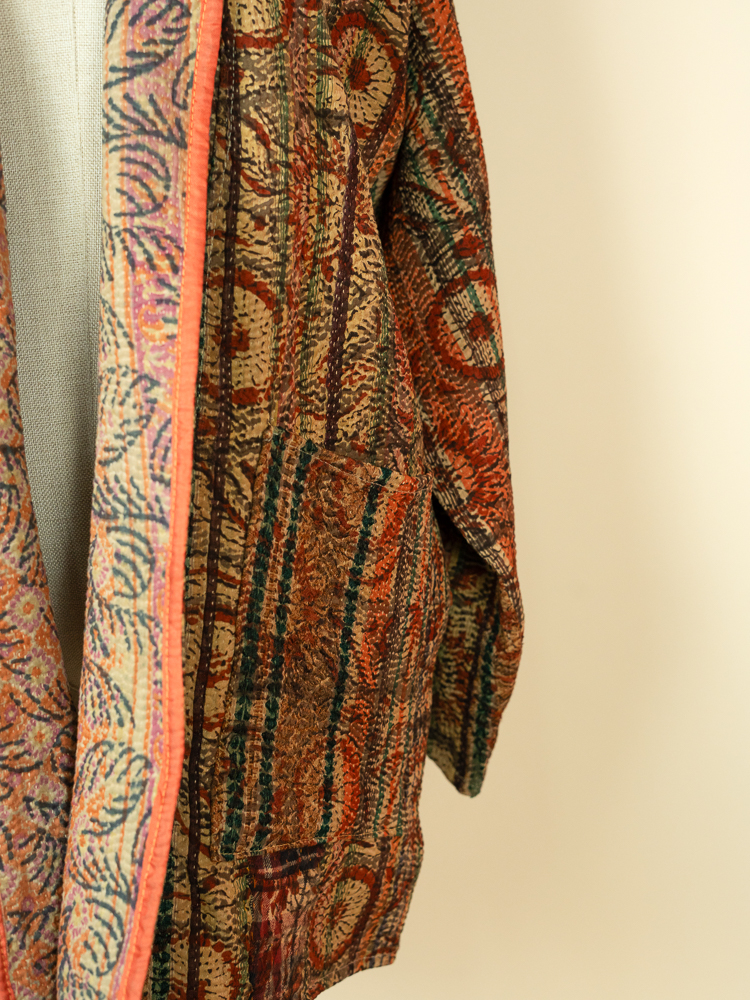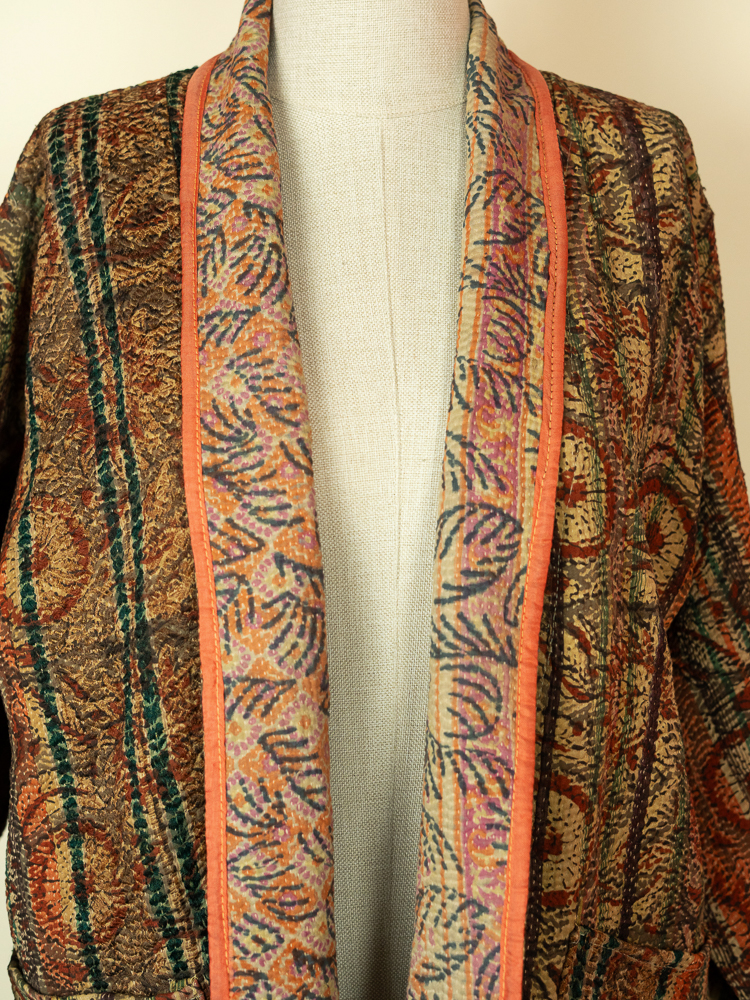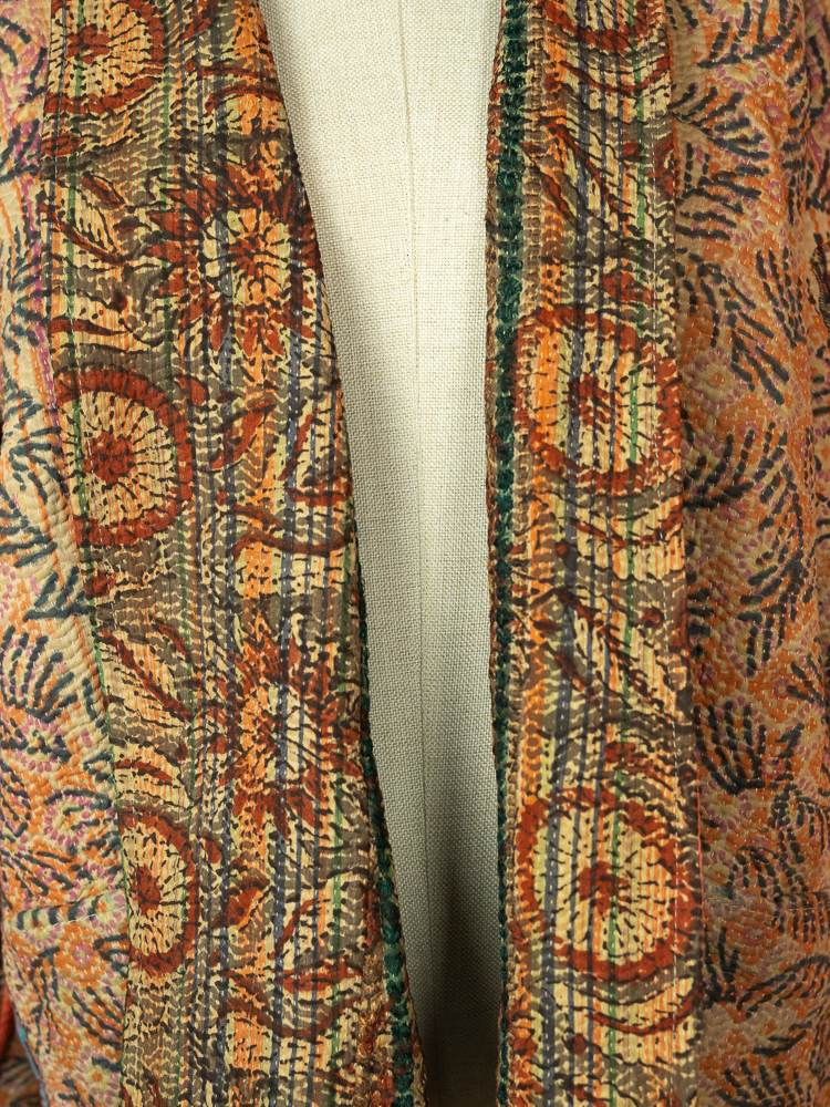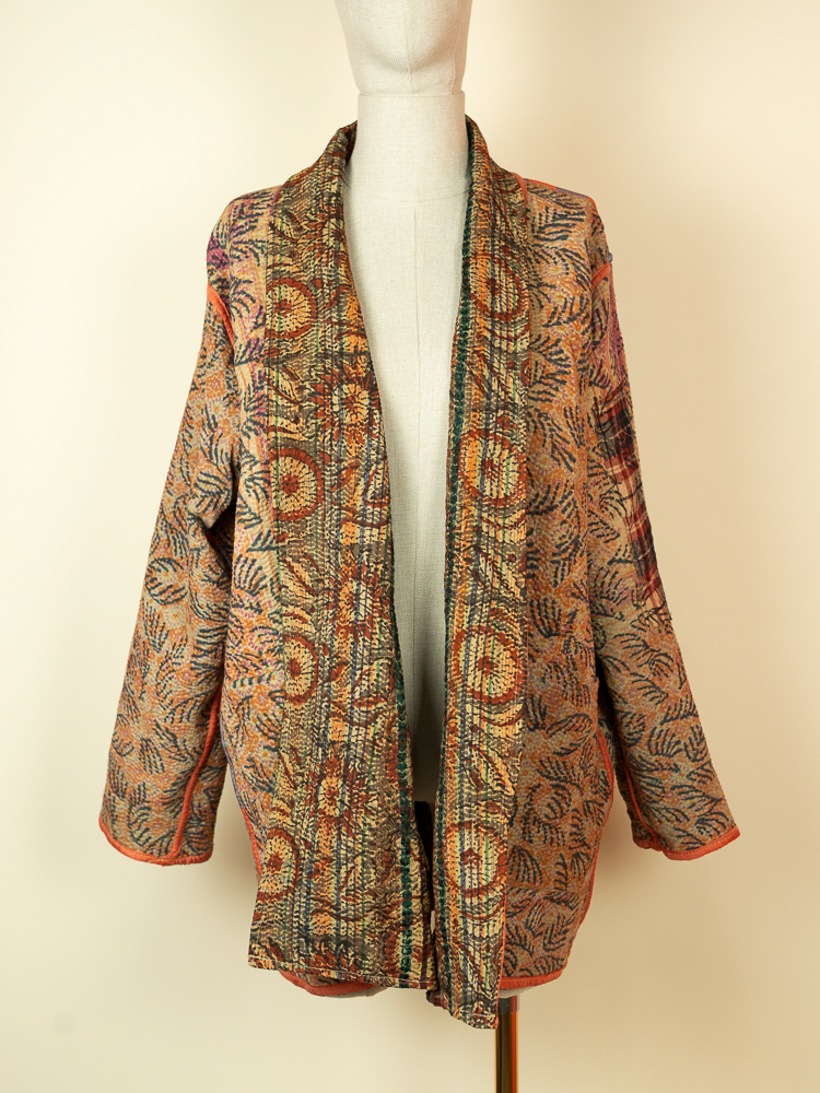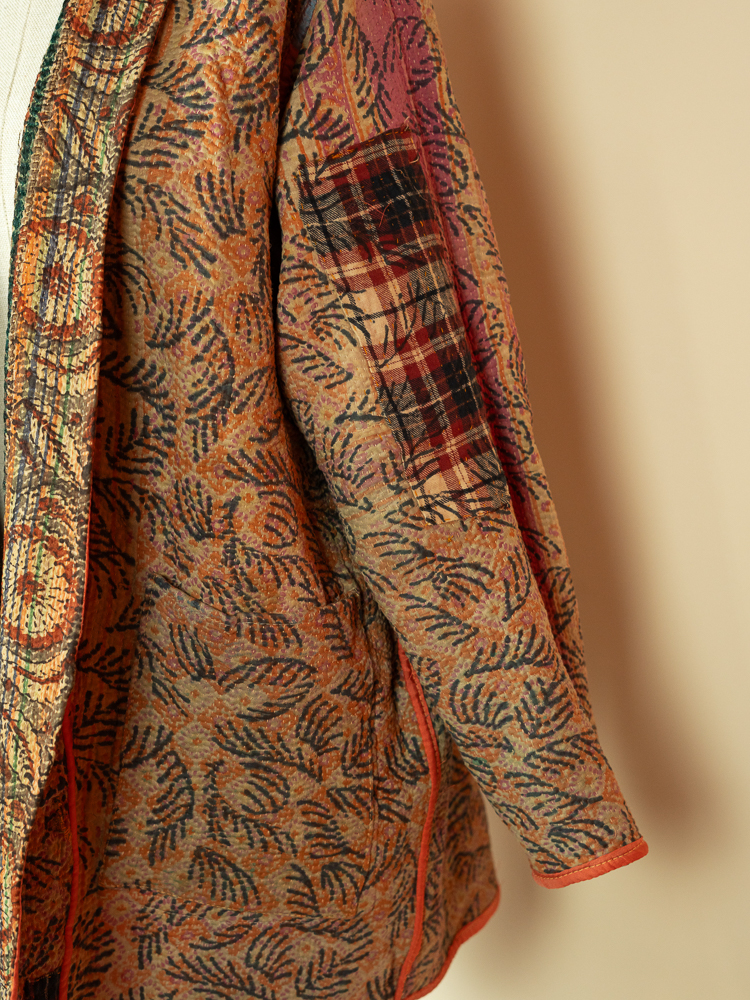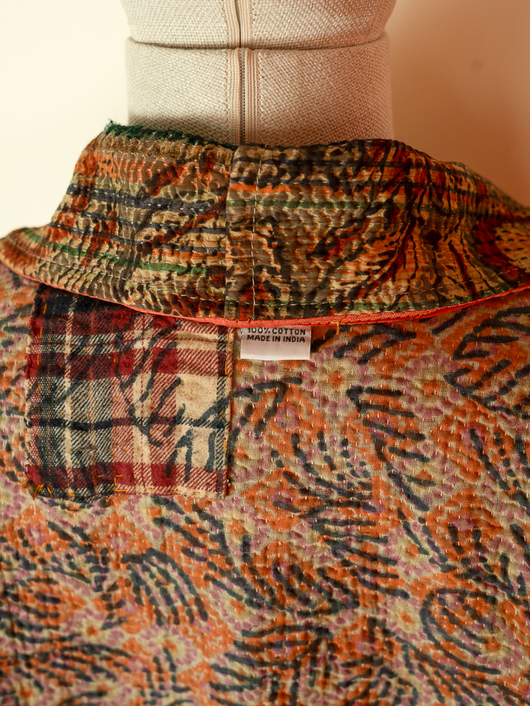 This one-of-a-kind kantha kimono jacket is made from repurposed vintage cotton textiles, making each piece truly unique.