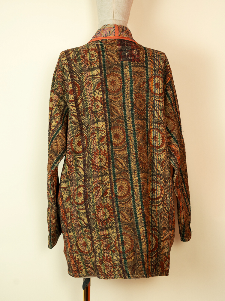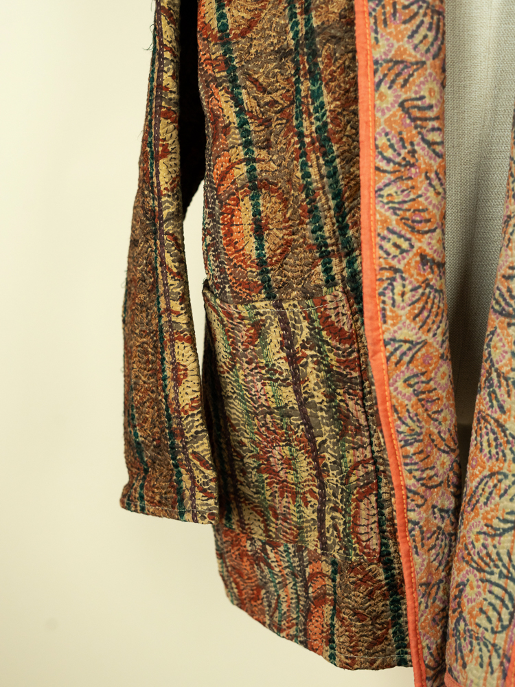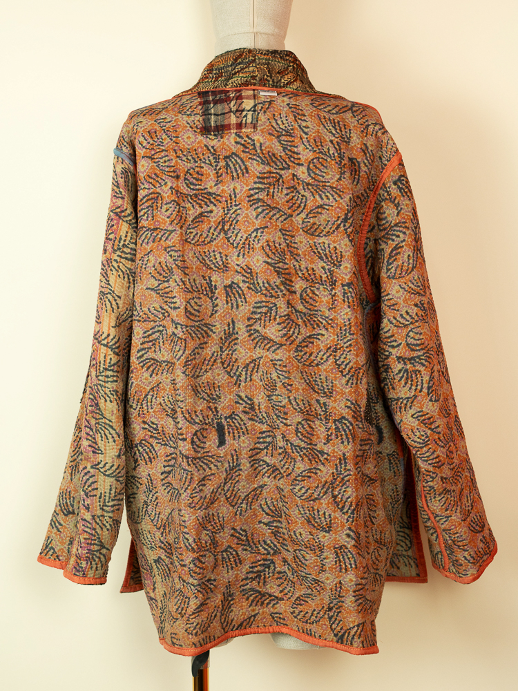 Hand-stitched using the traditional kantha technique, it features rich texture and depth. The reversible design allows you to wear it on both sides, offering two different looks in one garment.