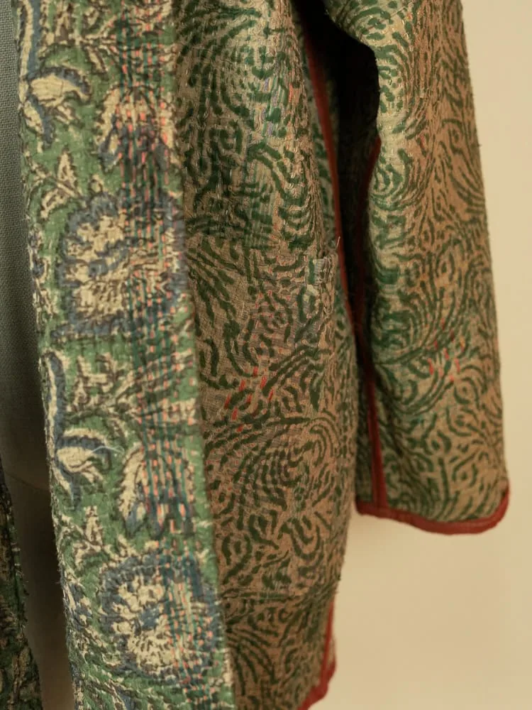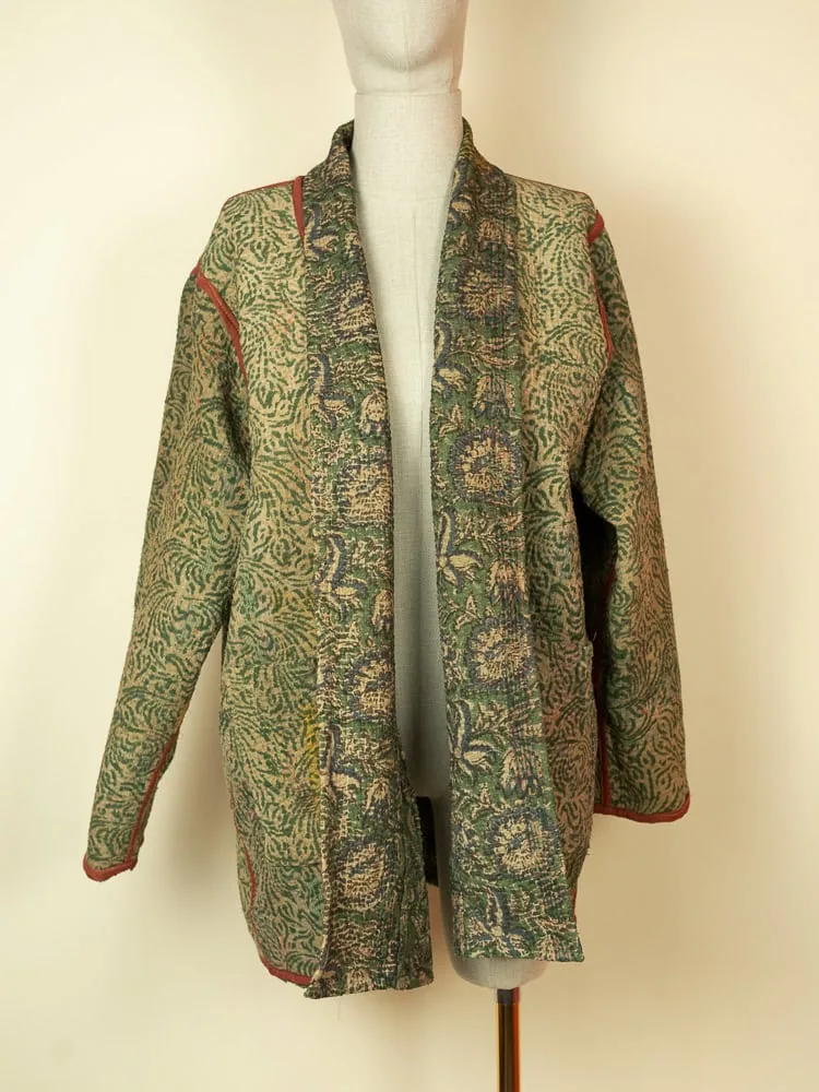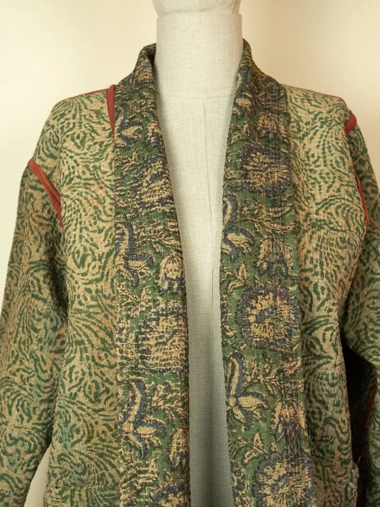This one-of-a-kind kantha kimono jacket is made from repurposed vintage cotton textiles, making each piece truly unique.