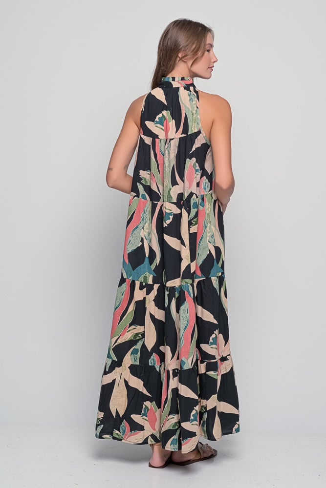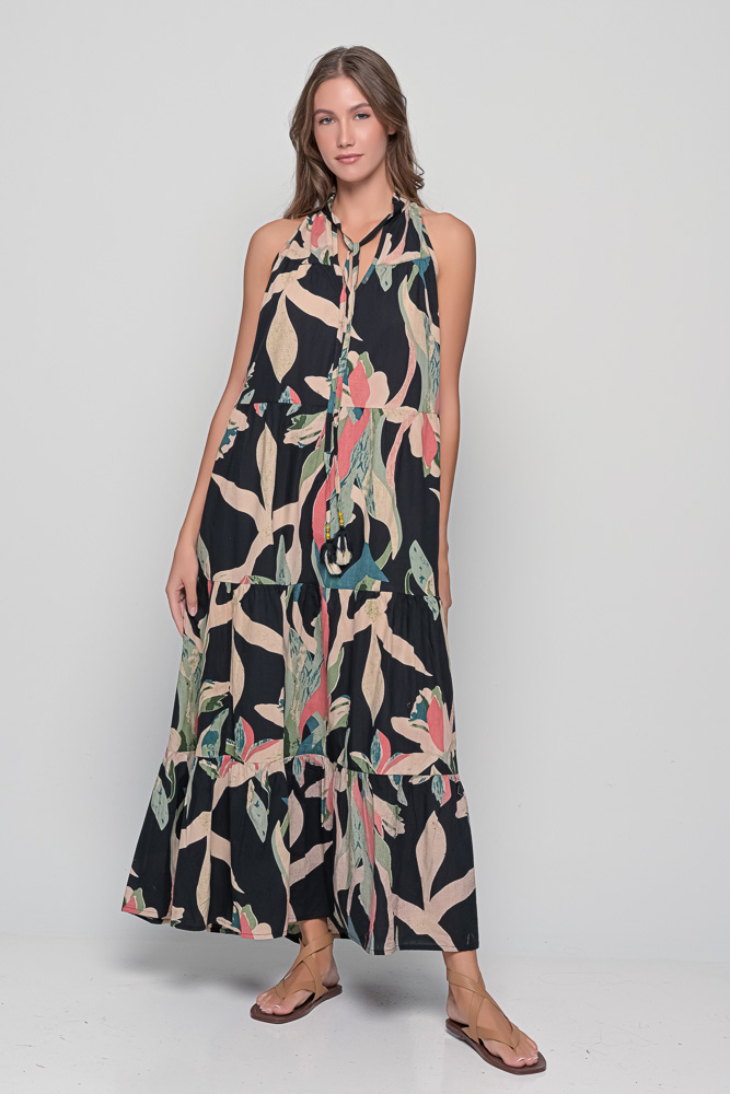 Featuring the striking Alpinia print in rich tones of black, green, and coral, the Samos Dress is a celebration of natural beauty and confident femininity. The halter neckline adds a graceful touch, while the loose, one-size silhouette offers complete comfort and freedom of movement.