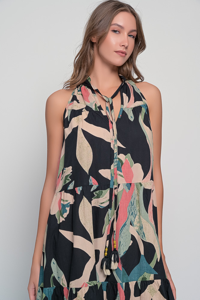 The Samos Dress in Alpinia Black captures the spirit of relaxed elegance and effortless summer charm. Made from soft, breathable cotton, this flowing dress moves beautifully with every step — perfect for warm days and breezy evenings.