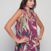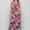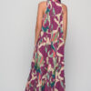 Soft cotton halter dress in Alpinia Purple print. Flowy silhouette and one-size fit for relaxed elegance and everyday comfort.