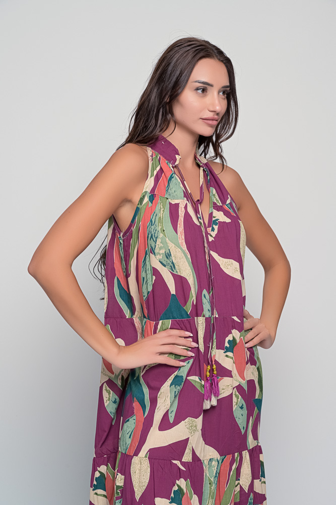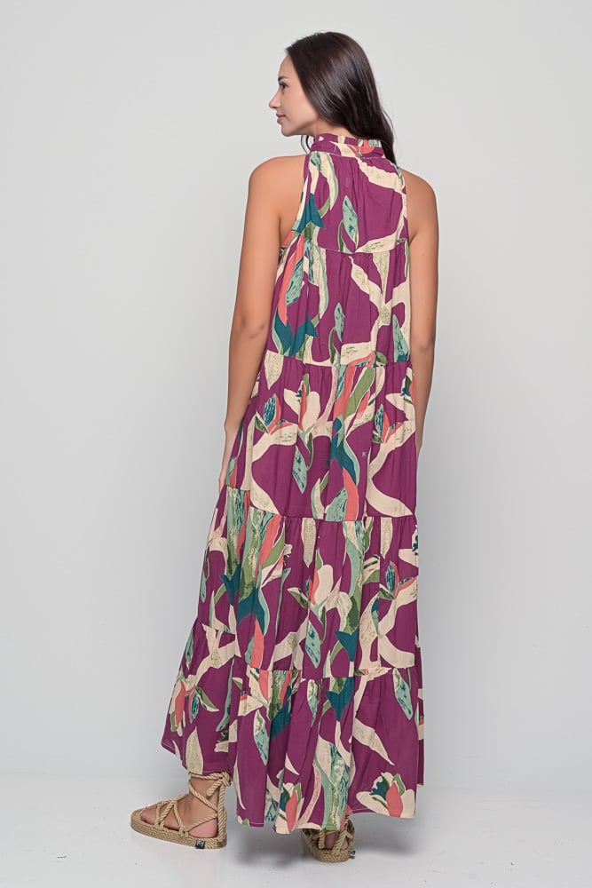 Soft cotton halter dress in Alpinia Purple print. Flowy silhouette and one-size fit for relaxed elegance and everyday comfort.