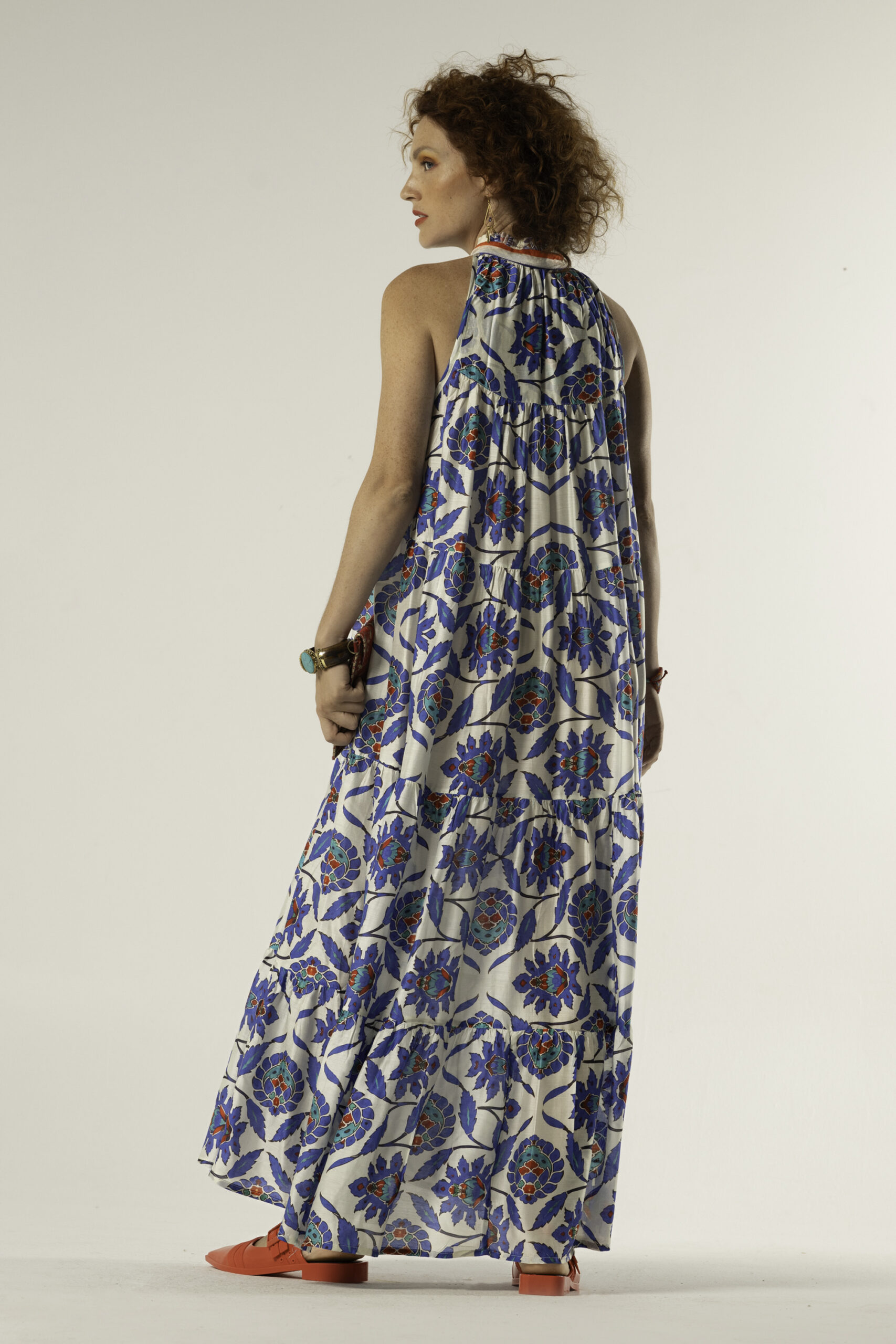 The halter neckline creates an open, airy feel, while the loose silhouette offers comfort and freedom of movement. Subtle gathers add volume without weight, giving the dress an elegant drape that works from day to evening.