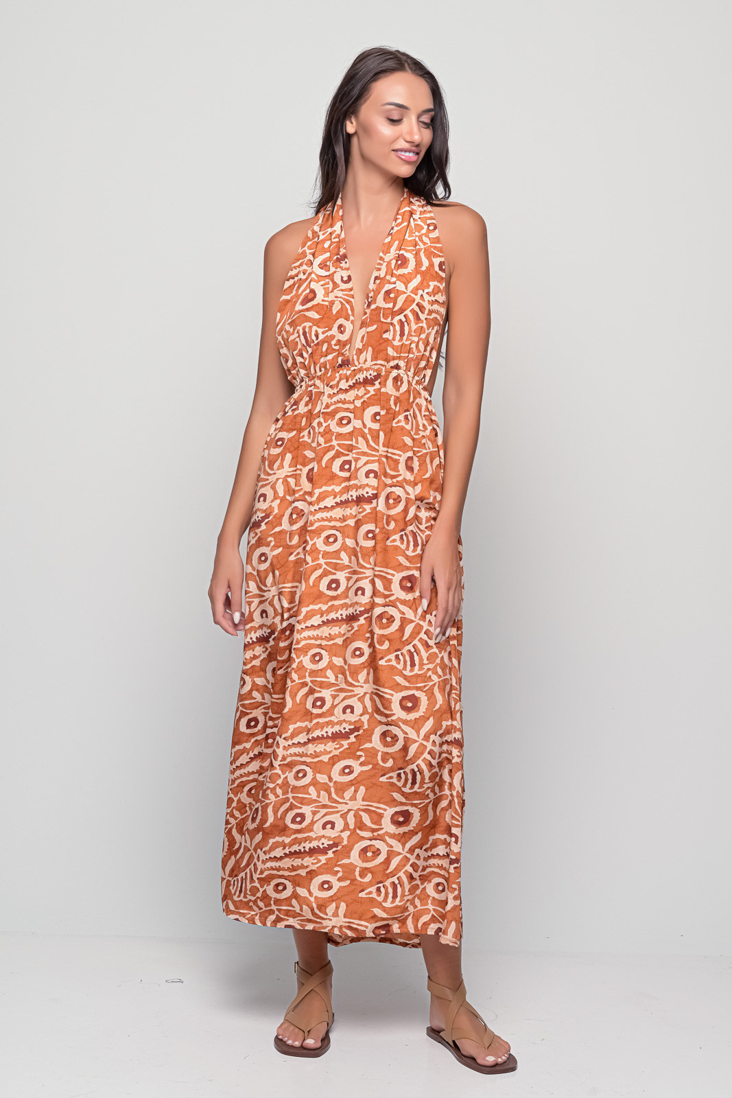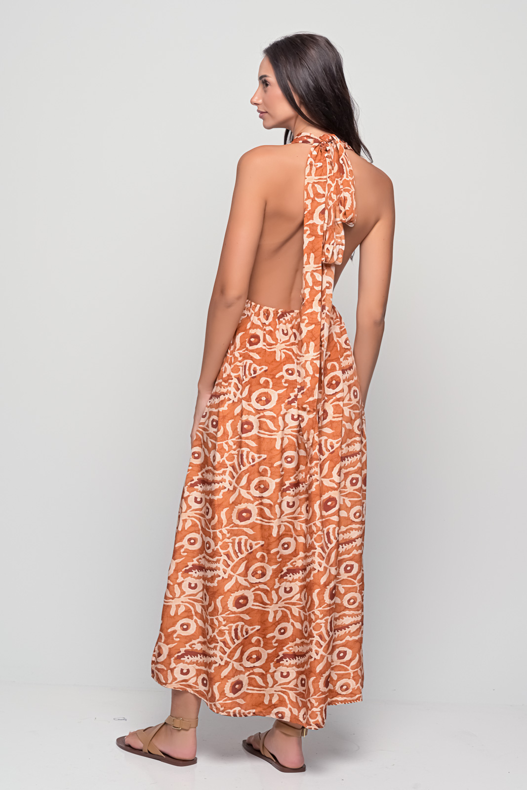 The Santorini Polymorphic Dress is designed for women who love versatility and creativity in their wardrobe. Featuring long straps that can be tied in multiple ways, this dress transforms effortlessly from halter to cross-back, to chic front-tied looks.