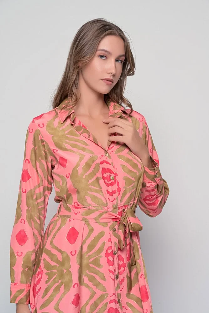 The Shirt Dress in Coral Seaweed brings together elegance, color, and comfort in one timeless design. Crafted from soft and fluid saree silk, this dress features the vibrant Seaweed print in coral and earthy tones — a striking combination inspired by natural textures and tropical landscapes.