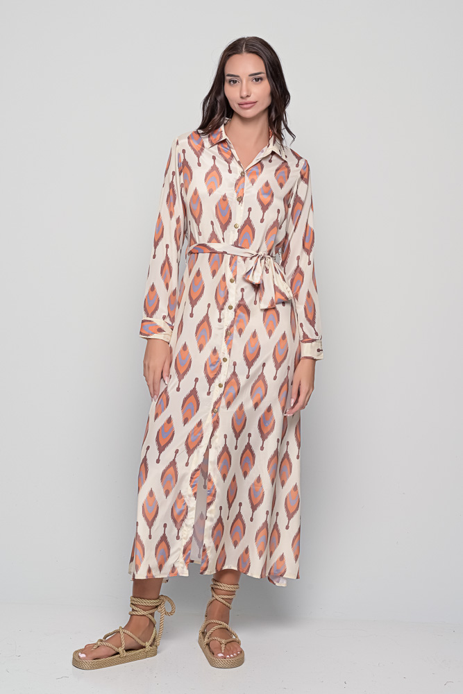 Graceful and effortlessly chic, the Shirt Dress in Flame Beige captures the essence of understated sophistication. Made from smooth and lightweight saree silk, this piece showcases the elegant Flame print, a soft geometric motif in warm neutral tones that radiates timeless beauty.