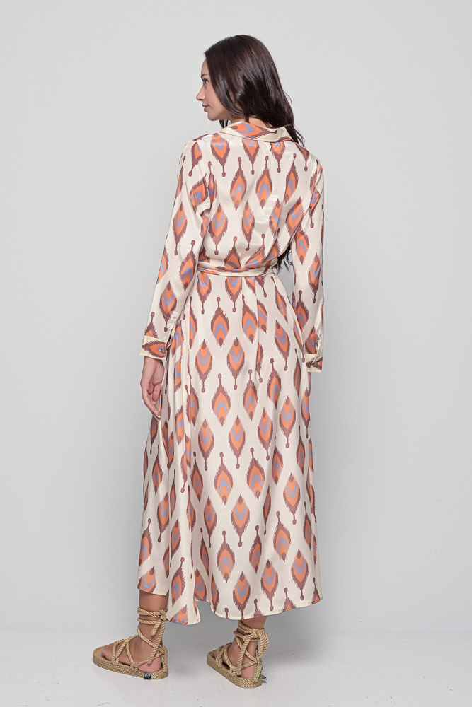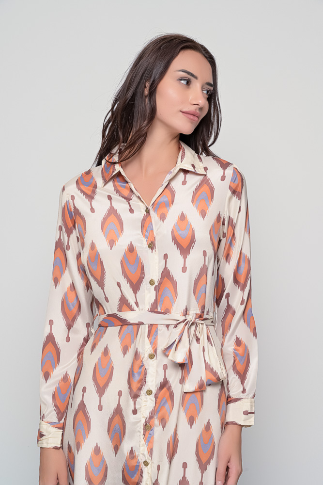 Designed with a classic shirt collar, button-down front, and matching waist tie, it offers the perfect combination of structure and fluidity. The silk fabric drapes beautifully, flattering all body types while allowing freedom of movement and all-day comfort.