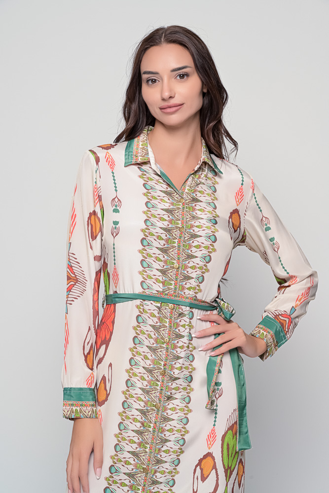 With its button-down front, classic shirt collar, and waist tie belt, this dress brings timeless sophistication with a playful twist. The silky fabric drapes fluidly over the body, creating an elegant silhouette that flatters all figures.