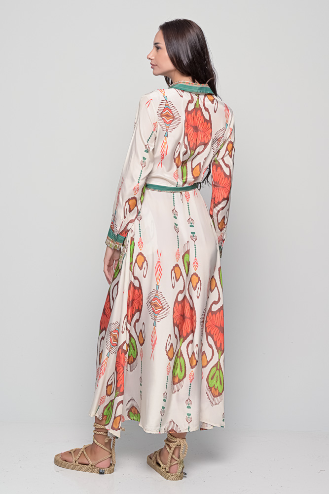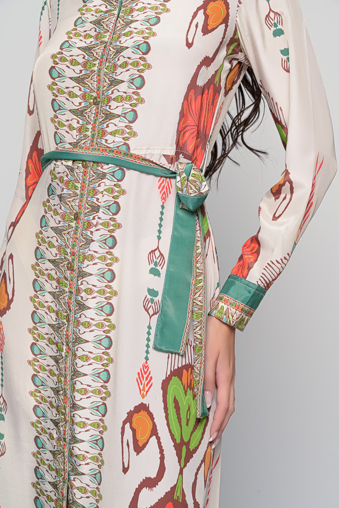 The Shirt Dress in Ojos Print is a captivating mix of artistry and comfort. Crafted from luxurious saree silk, this dress features the eye-catching Ojos print, a striking composition of abstract motifs in vibrant earthy tones — blending cultural charm with modern ease.