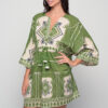 Light and effortless, the Short Kaftan Green Cotton Dress is designed for summer freedom. With a flattering V-neckline, relaxed sleeves, and a flowy cut, it offers comfort while the tasseled waist tie lets you adjust the fit. Crafted in breathable cotton with a bold green print, it’s ideal for seaside escapes, resort living, or warm days in the city.