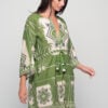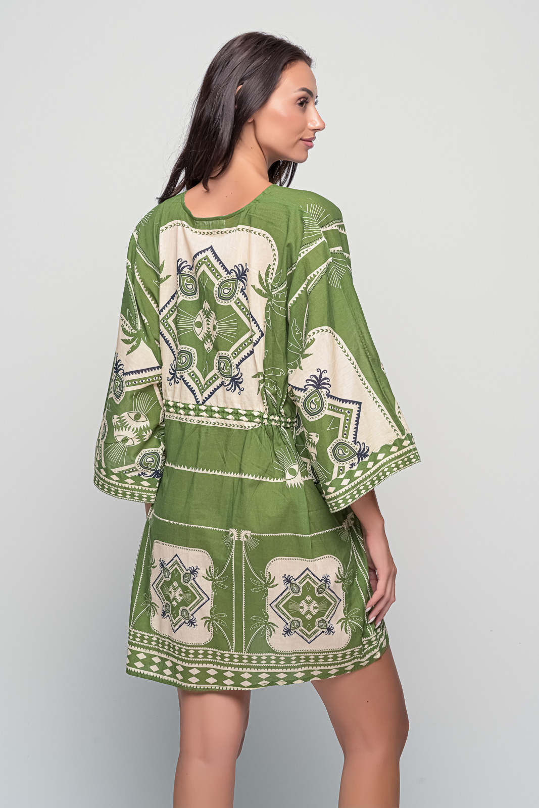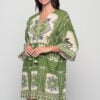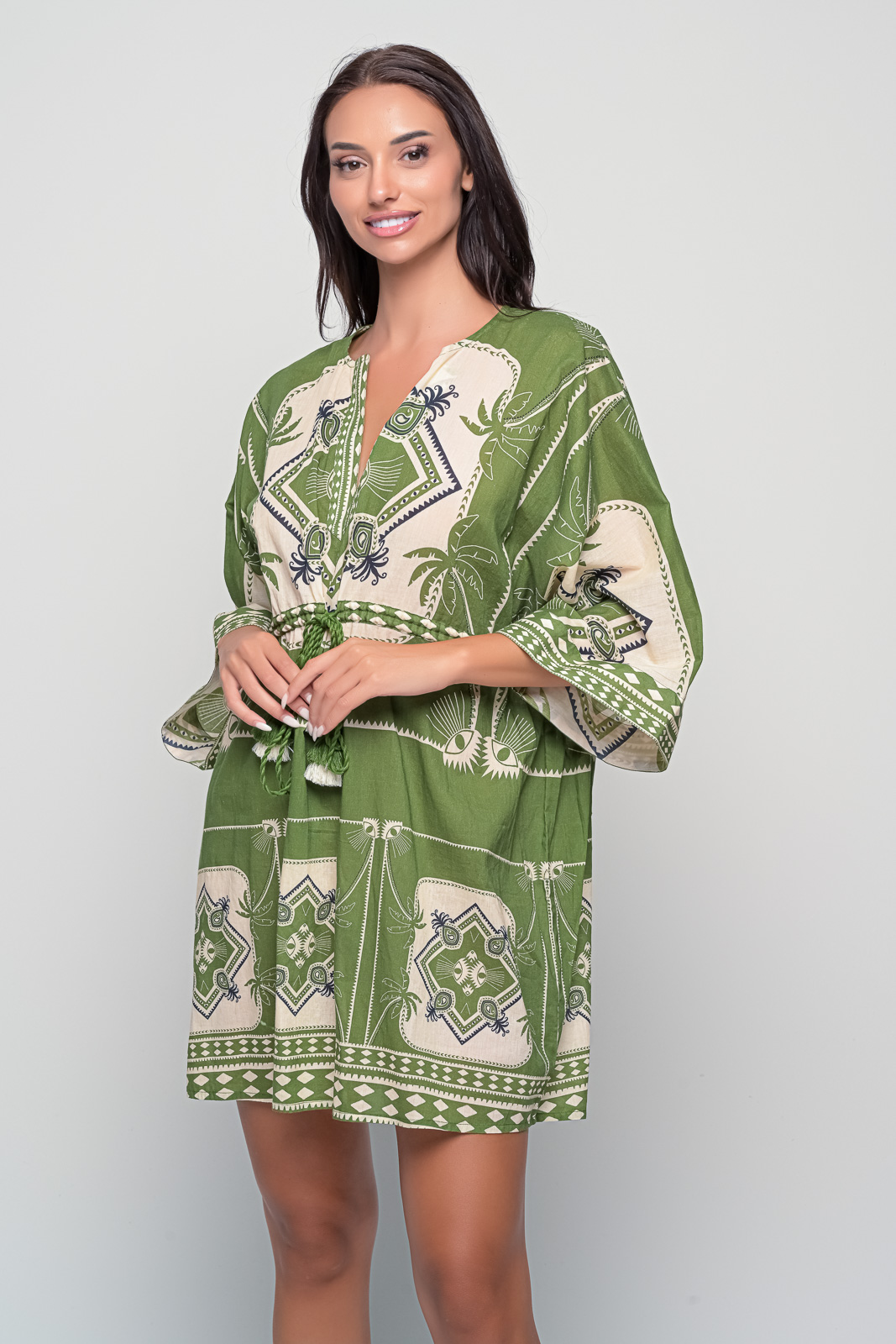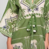 Light and effortless, the Short Kaftan Green Cotton Dress is designed for summer freedom. With a flattering V-neckline, relaxed sleeves, and a flowy cut, it offers comfort while the tasseled waist tie lets you adjust the fit. Crafted in breathable cotton with a bold green print, it’s ideal for seaside escapes, resort living, or warm days in the city.
