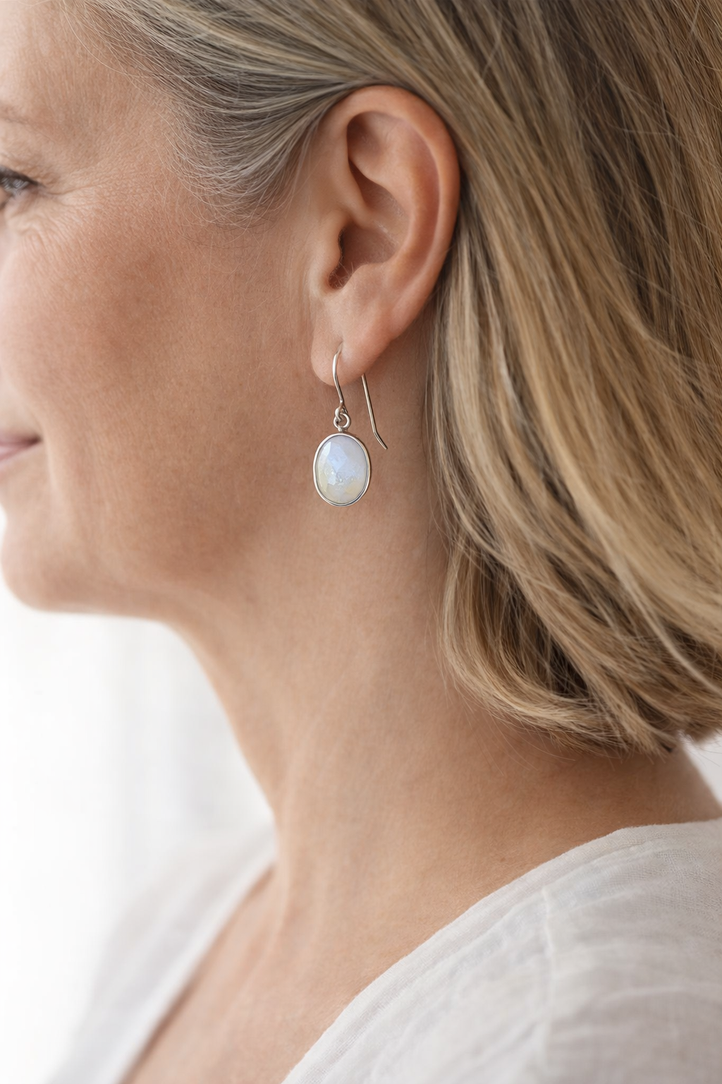 The oval drop shape creates balance and fluidity, while the natural glow of the moonstone adds a refined, luminous presence. Lightweight and versatile, they move easily from day to evening.