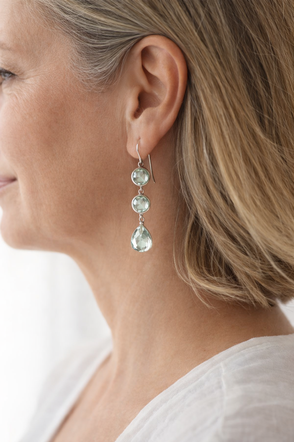 The elongated drop design creates gentle movement and balance, making them easy to wear from day to evening. The quartz stones add a clean, luminous tone that pairs naturally with both neutral and vibrant looks.
