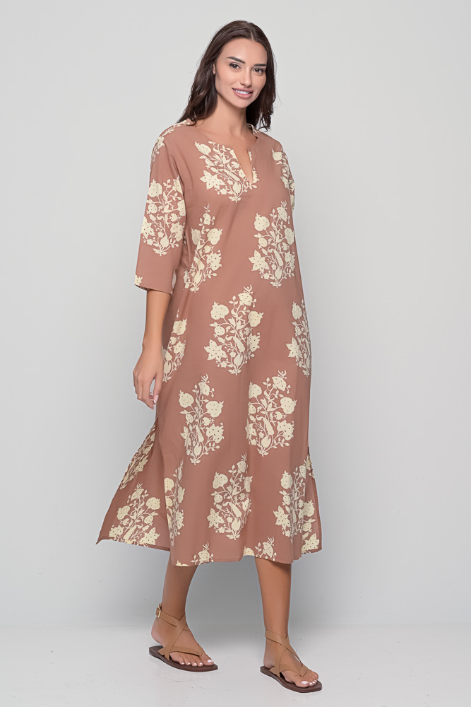 The Titli Caftan is a Knowmad staple, crafted from breathable cotton and styled in the refined Palladio print. Its free-size cut, mid-length shape, and relaxed silhouette make it an easy-to-wear piece for everyday elegance or travel. With a V-slit neckline and ¾ sleeves, this caftan brings effortless comfort with a sophisticated bohemian touch.