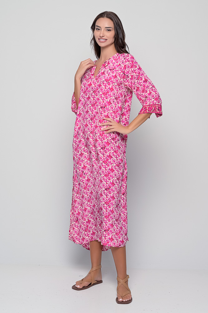 The Titli Caftan in fuchsia Tuareg print is the ultimate bohemian essential, perfect for both casual wear and elegant gatherings.