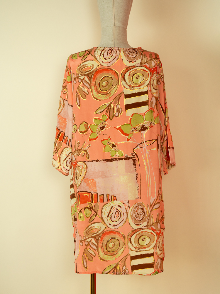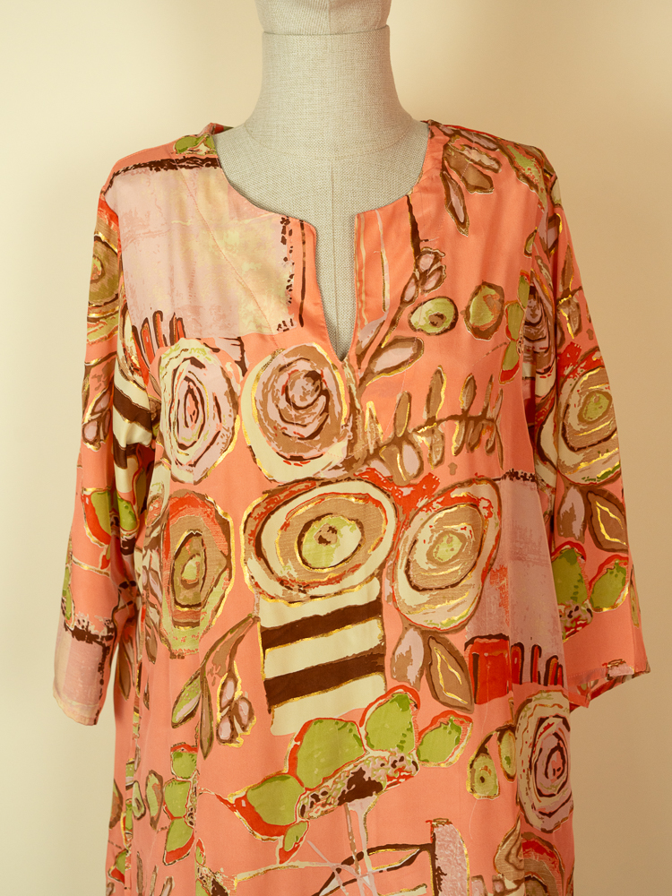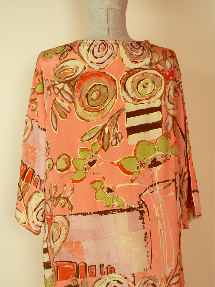 Featuring a coral base with an abstract rose-inspired print, it brings a vibrant yet refined aesthetic. The shorter length, loose silhouette, and open neckline create a flattering and versatile shape.