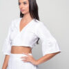 The wrap-style V-neck design with tie closure creates a flattering silhouette, while the wide flared sleeves bring a relaxed, boho-inspired charm. The cropped length makes it perfect for pairing with high-waisted skirts, pants, or shorts for a modern summer look.