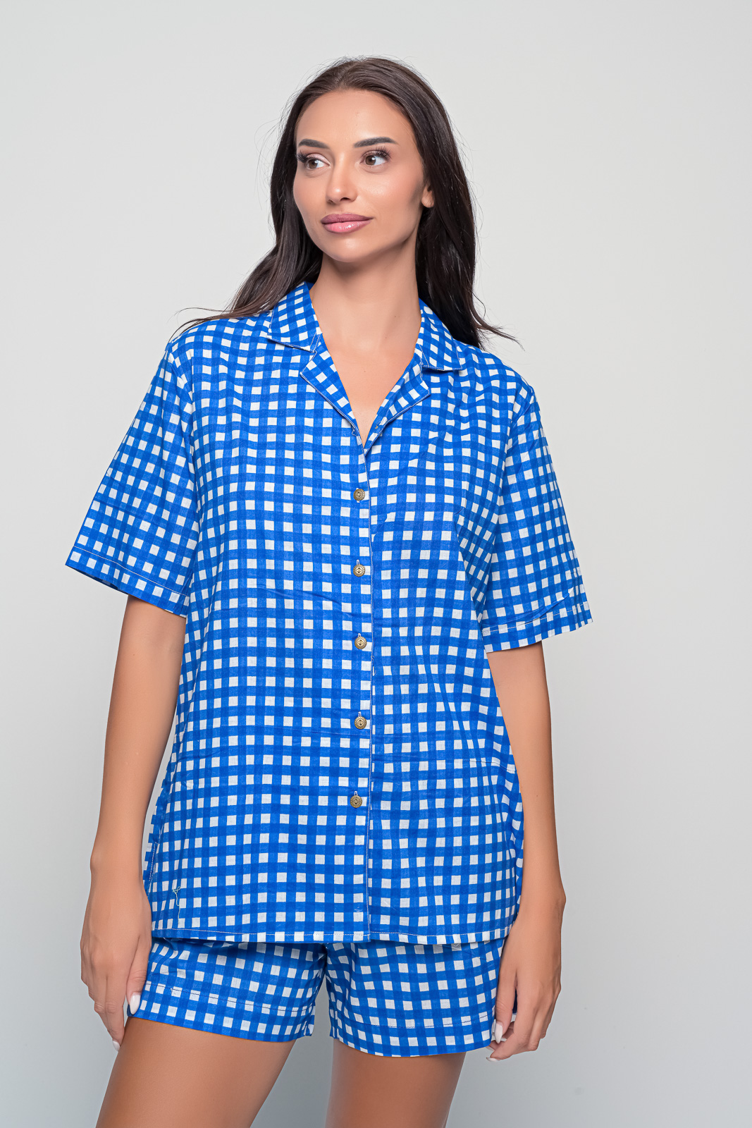 Upgrade your wardrobe with our women’s blue checked two-piece set, designed for comfort, versatility, and modern style. This matching outfit includes: