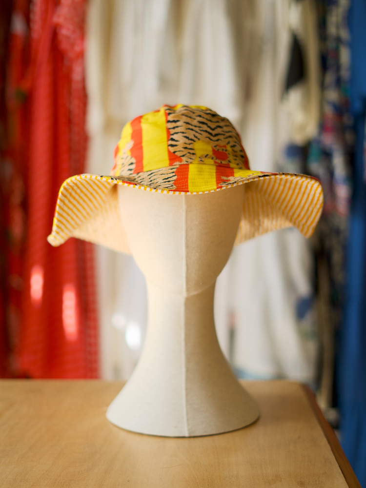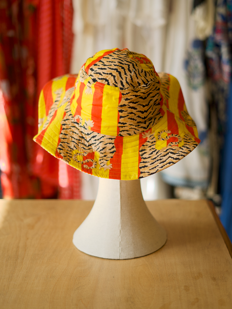 Yellow cotton hat with stripes tiger print made from lightweight washable cotton.